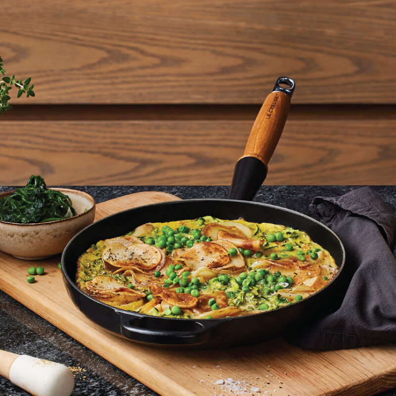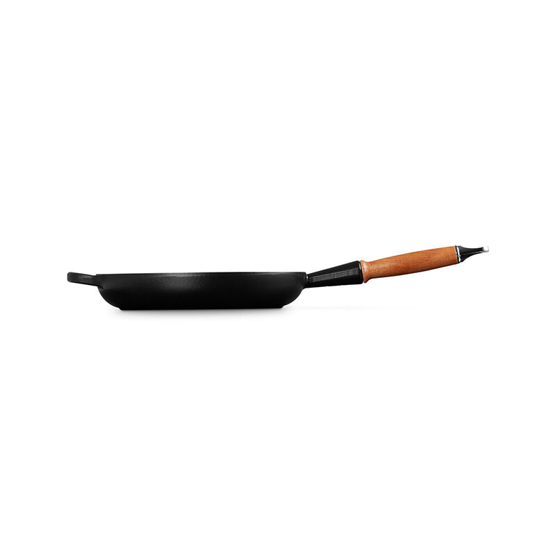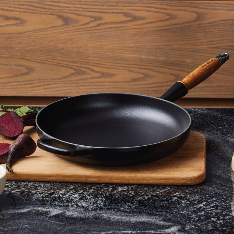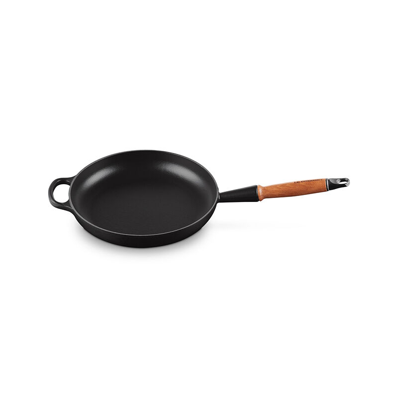 A vintage Le Creuset design refreshed for modern kitchens, the enameled cast iron Alpine Wood Handle Fry Pan is a versatile pan for everything from searing and saut¨¦ing, to pan frying, stovetop casseroles and more. Sloped sides make it easy to stir sauces and flip crepes, while exceptional heat distribution and retention ensures food is cooked to perfection. The black satin enamel interior eliminates the need for the traditional seasoning and maintenance of raw cast iron ¨C the enamel develops a natural patina over time making it virtually non-stick and easy to clean. The pan is finished with a durable wood handle that is designed to stay cool and comfortable while cooking, yet elegantly handsome for stove to table serving.