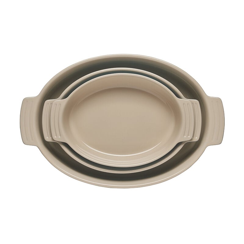 The Classic Oval Baking Dish Set features three indispensable baking dishes needed in every kitchen. The longer oval shape is particularly well-suited for roasting vegetables and marinating longer cuts of meat, while the rounded corners and wide-grip handles are ideal for serving gratins, casseroles and warm dips from oven to table. Crafted from premium stoneware to ensure food is cooked to perfection, the set of 3 baking dishes feature a colorful glaze that is virtually non-stick for easy cleanup.