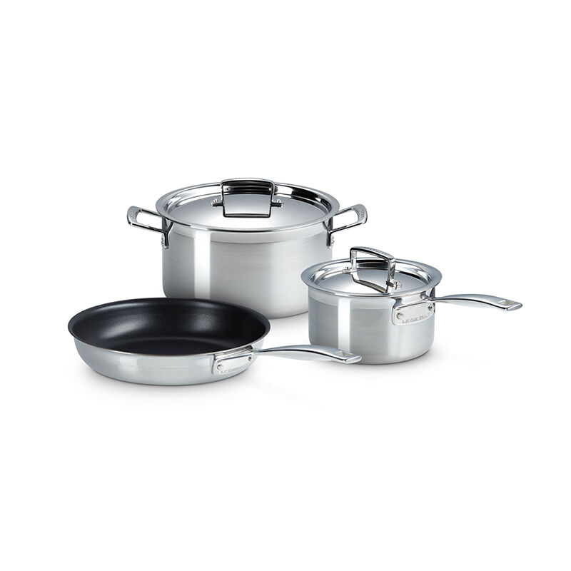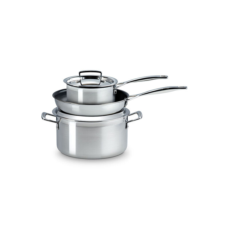 Le Creuset Classic Stainless Steel delivers long-lasting durability and exceptional performance, designed for the passionate cook looking to level up. A durable kitchen workhorse, it features triple-layer construction with an aluminum core bonded between layers of stainless steel, ensuring even heat distribution for exceptional results every time. The satin matte exterior, blended with polished accents, resists scratches, marks and fingerprints, maintaining its timeless elegance through daily use. Thoughtful details like angular loop lids and ergonomic handles add a touch of modern sophistication, while practical features such as etched capacity markings and a dripless pouring rim make preparation seamless and cleanup a breeze.