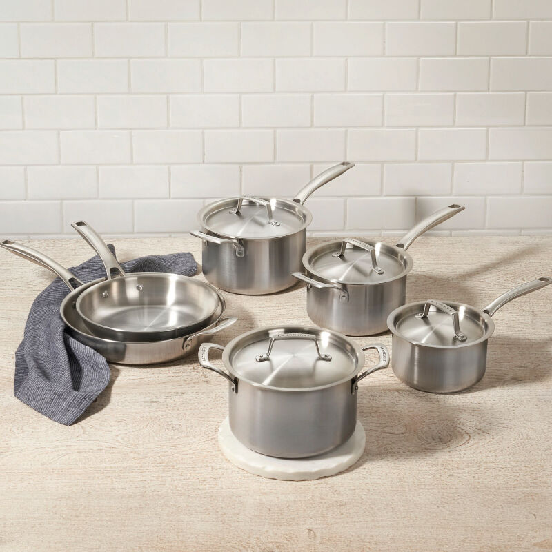 Le Creuset’s Essential Stainless Steel 10-Piece Cookware Set is expertly crafted for the everyday cook and engineered for performance, style and lasting quality. Durable and easy to maintain, the triple layer construction of an aluminum core bonded between layers of stainless steel ensures even heat distribution, while the full matte brushed exterior is resistant to scratches and marks. Innovative details such as interior capacity markings and a dripless pouring rim save valuable prep time and make cleanup a breeze.