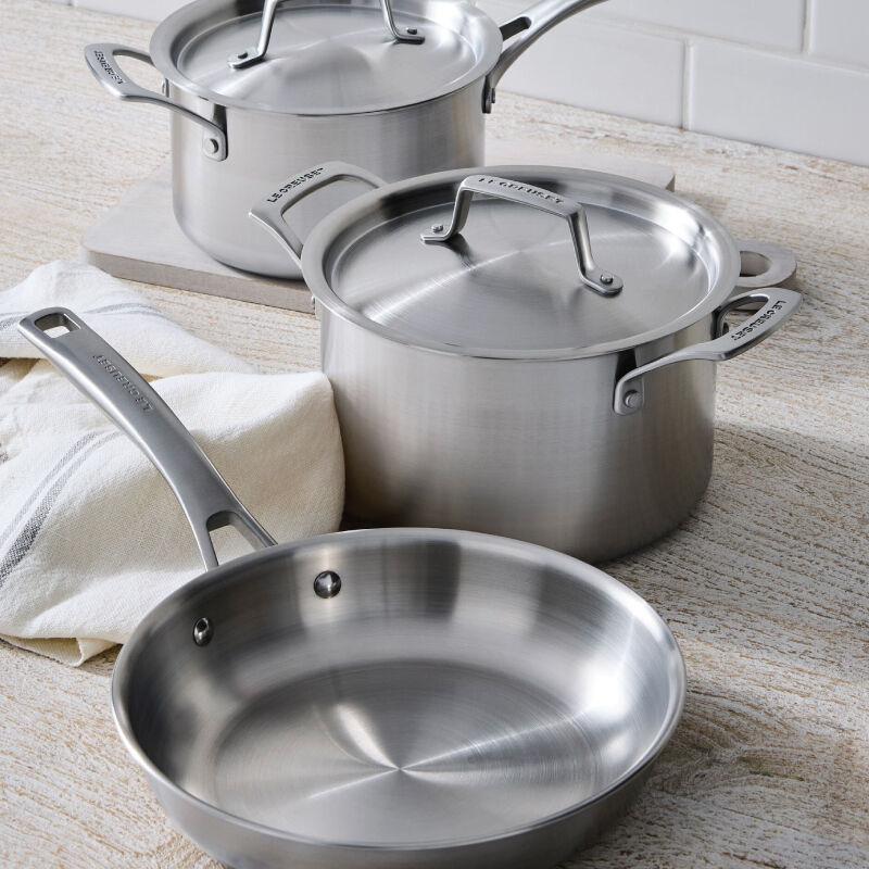 Le Creuset’s Essential Stainless Steel 5-Piece Cookware Set is expertly crafted for the everyday cook and engineered for performance, style and lasting quality. Durable and easy to maintain, the triple layer construction of an aluminum core bonded between layers of stainless steel ensures even heat distribution, while the full matte brushed exterior is resistant to scratches and marks. Innovative details such as interior capacity markings and a dripless pouring rim save valuable prep time and make cleanup a breeze.