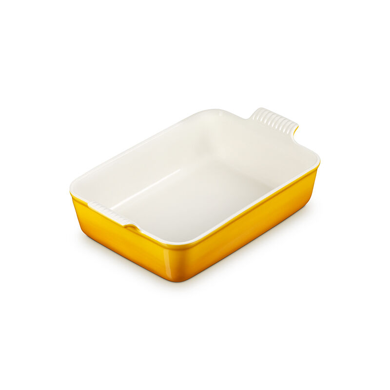 Our largest baking dish yet, the Le Creuset Heritage Deep Rectangular Lasagna Dish is generously sized at 6.75 quarts of capacity for towering layers of lasagna, whole roasted turkeys or prime rib, casseroles for a crowd, and more. Designed to perfectly fit most brands of lasagna noodles, the more than 4 inches of depth provides ample room for several layers of noodles, melting cheese and bubbling sauce without spilling over. From oven to table, the beautiful classic French design with scalloped handles is crafted from premium stoneware for exceptional heat distribution to ensure food is uniformly brown and cooked to perfection. The durable colorful glaze is nonporous, non-reactive and virtually non-stick for easy cleanup.