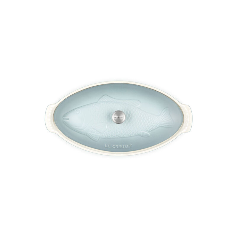 The Heritage Fish Baker is a covered oval baking dish embossed with an elegant fish motif and brushed gold knob. A striking presentation from oven to table, it¡¯s perfect not only for baking, roasting, steaming, and broiling all manner of fish recipes ¨C but also for roasting and steaming vegetables and meat, bubbling casseroles, one dish meals and more. The ridges on the bottom of the baking dish keep food elevated for even cooking and browning while also easing in the removal of the fish or meat. The embossed stoneware lid locks in moisture and keeps odors contained. Crafted from the finest quality stoneware to ensure food is cooked to perfection, the dish features a colorful glaze that is virtually non-stick for easy cleanup.