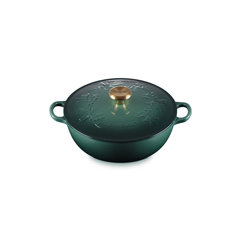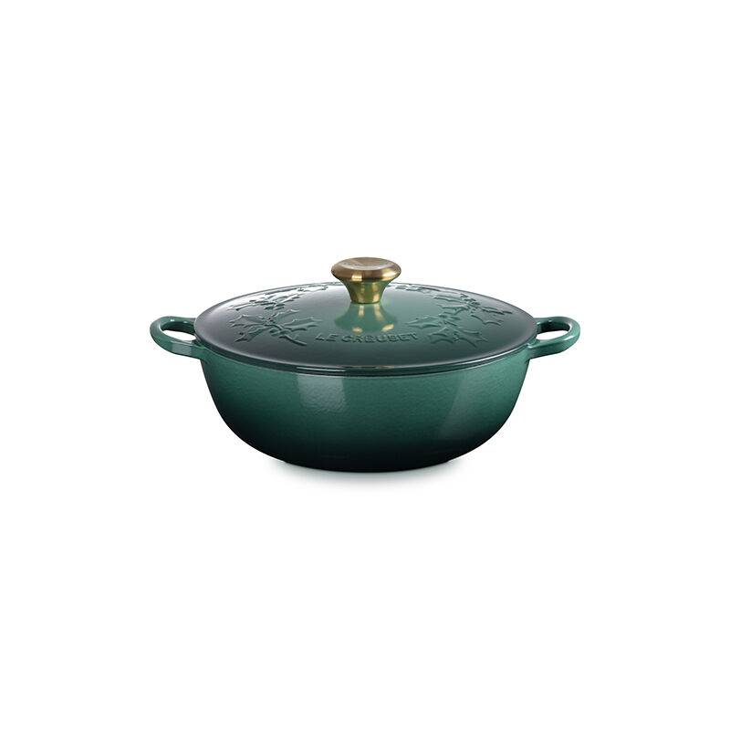 The Holly Collection Traditional Chef¡¯s Oven features an elegantly scrolled and embossed holly leaf design that will spread good cheer and joyful style year after year. Both functional and beautiful, it¡¯s the ideal vessel for merry soups, pastas, braising and even baking. Sloped sides increase the efficiency and effectiveness of stirring by promoting continuous movement even with the lid in place, and the depth provides ample room for simmering. Crafted from our legendary enameled cast iron, it has exceptional heat distribution and retention qualities to lock in flavor and loop handles designed for easy lifting. The festive, colorful enameled surface minimizes sticking and staining, requires no pre-seasoning, and is easy-to-clean.