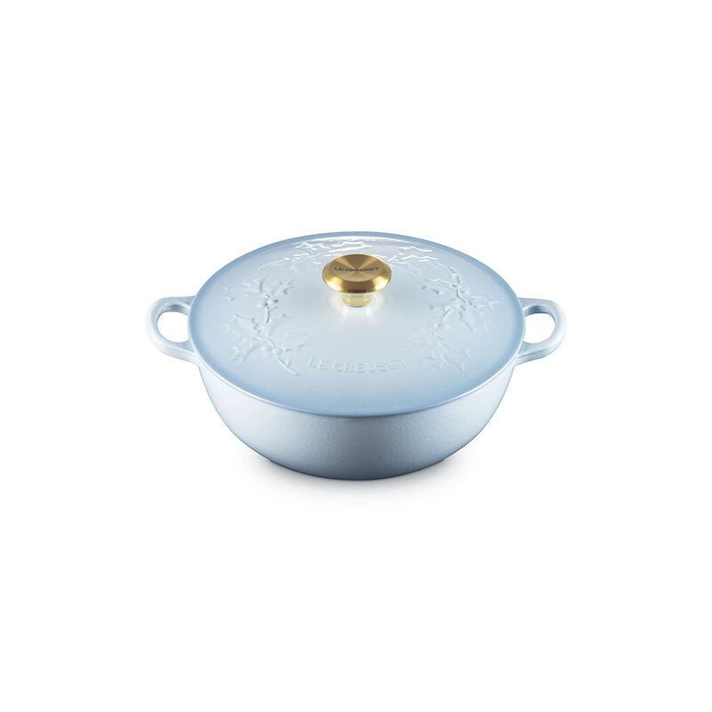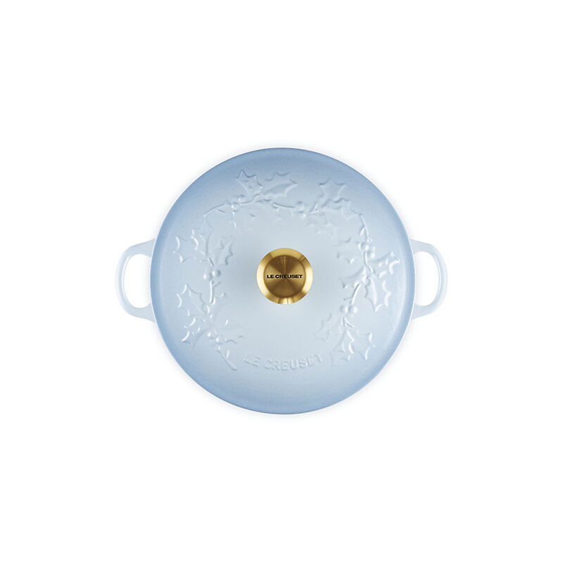 The Holly Collection Traditional Chef???s Oven features an elegantly scrolled and embossed holly leaf design that will spread good cheer and joyful style year after year. Both functional and beautiful, it???s the ideal vessel for merry soups, pastas, braising and even baking. Sloped sides increase the efficiency and effectiveness of stirring by promoting continuous movement even with the lid in place, and the depth provides ample room for simmering. Crafted from our legendary enameled cast iron, it has exceptional heat distribution and retention qualities to lock in flavor and loop handles designed for easy lifting. The festive, colorful enameled surface minimizes sticking and staining, requires no pre-seasoning, and is easy-to-clean.