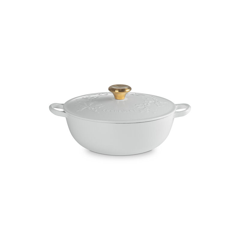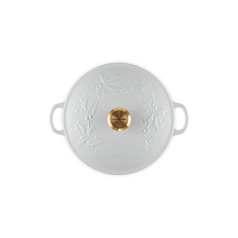 The Holly Collection Traditional Chef¡¯s Oven features an elegantly scrolled and embossed holly leaf design that will spread good cheer and joyful style year after year. Both functional and beautiful, it¡¯s the ideal vessel for merry soups, pastas, braising and even baking. Sloped sides increase the efficiency and effectiveness of stirring by promoting continuous movement even with the lid in place, and the depth provides ample room for simmering. Crafted from our legendary enameled cast iron, it has exceptional heat distribution and retention qualities to lock in flavor and loop handles designed for easy lifting. The festive, colorful enameled surface minimizes sticking and staining, requires no pre-seasoning, and is easy-to-clean.