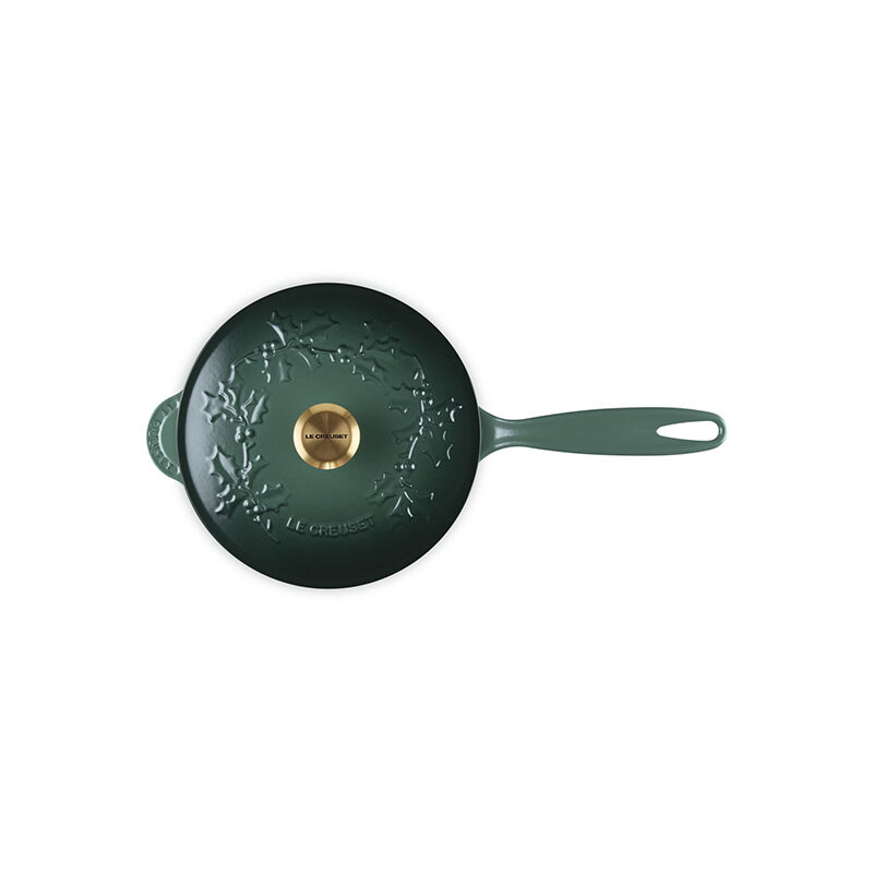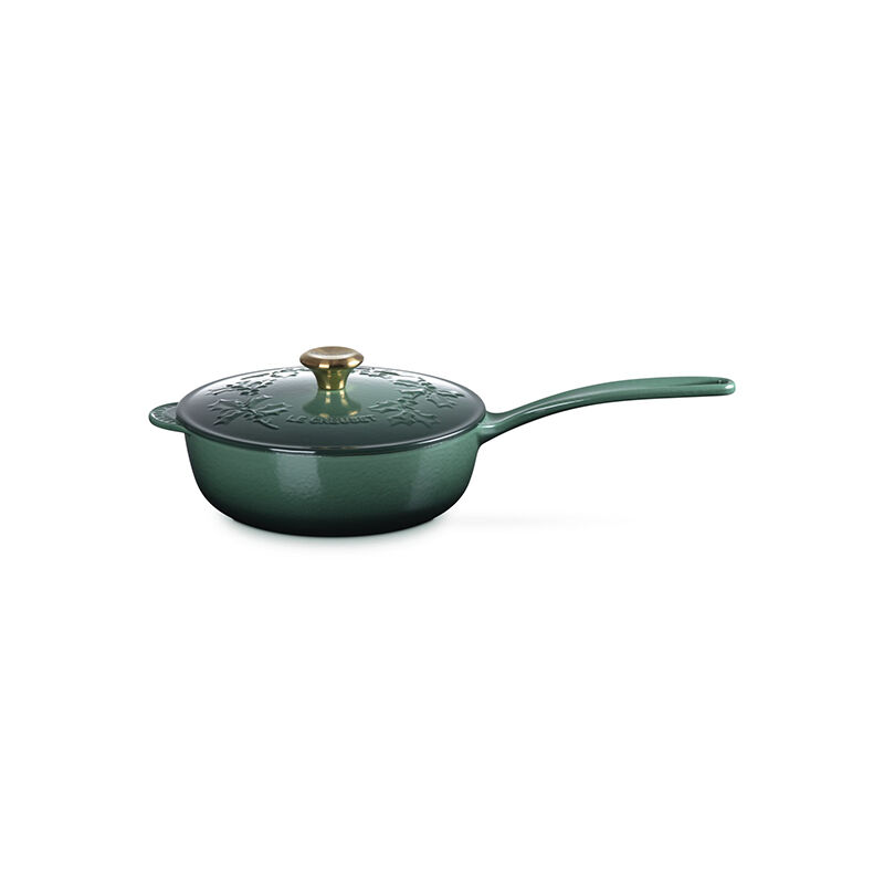 The Holly Collection Traditional Saucier features an elegantly scrolled and embossed holly leaf design that will spread good cheer and joyful style year after year. A chef¡¯s favorite, the Saucier has a smooth contoured interior that is optimal for making merry sauces, side dishes and saut¨¦ing vegetables. Sloping sides and a rounded bottom facilitate stirring and whisking, while the broad surface area allows liquids to evaporate quickly. Crafted from our legendary enameled cast iron, it has exceptional heat distribution and retention qualities to lock in flavor and moisture and keep dishes warm from stove to oven to table. The festive, colorful enameled surface minimizes sticking and staining, requires no pre-seasoning, and is easy-to-clean.