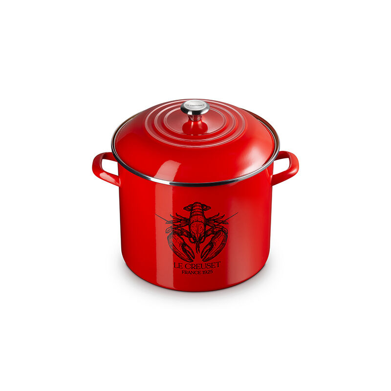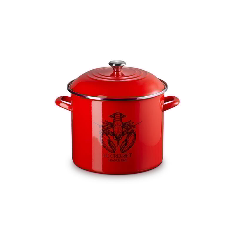 Tall straight sides and extra large capacity make the enamel on steel Lobster Stockpot ideal for soups, stocks, cooking pasta, boiling seafood and more. Crafted from premium carbon steel, it delivers our fastest-heating performance to quickly bring water to a boil to speed up prep and cooking time, and retains heat to keep food and liquids warm. Lightweight and durable, the stockpot is finished with a vibrant red enamel featuring an elegant lobster motif, and a stainless steel knob and loop handles for easy lifting. The easy to clean colorful porcelain enamel coating is non-reactive and resistant to stains and flavors, making it ideal for everyday use.