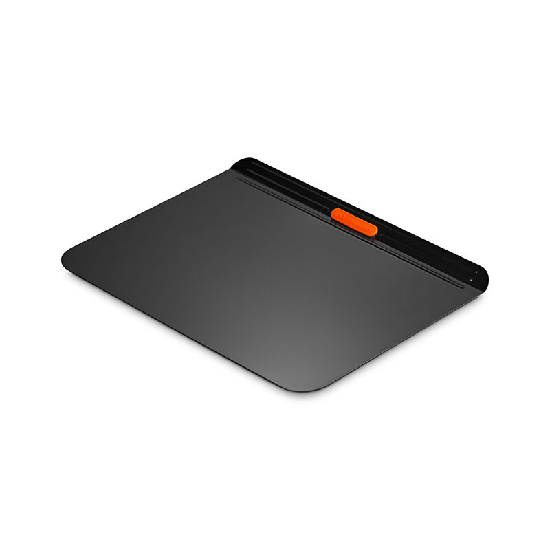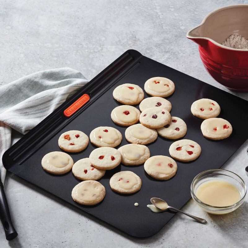 Bake perfectly golden-brown cookies, pastries and appetizers with the non-stick metal Cookie Sheet. An innovative silicone coating ensures easy release and effortless cleanup, while two layers of carbon steel surround a pocket of air for superior heat conduction and even baking. Lightweight and durable, the angled rim with heat-resistant silicone grips makes it easy to transfer a full pan to and from a hot oven.
