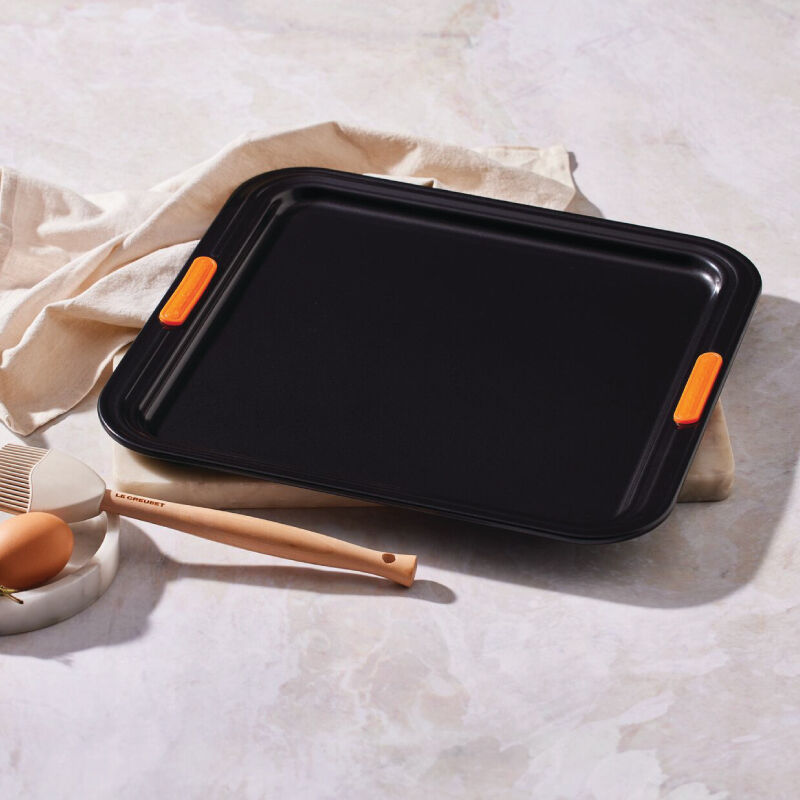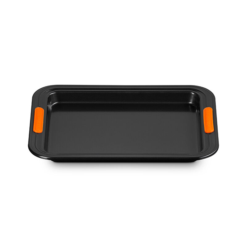 The Rectangular Baking Tray is perfect for everything from sheet cakes and brownies to roasting meat and vegetables. Slightly deeper than a Sheet Pan, an innovative silicone coating ensures easy release and effortless cleanup, while the heavy-gauge carbon steel construction delivers superior heat conduction and even baking. Lightweight and durable, the wide rims with heat-resistant silicone grips makes it easy to transfer a full pan to and from a hot oven.
