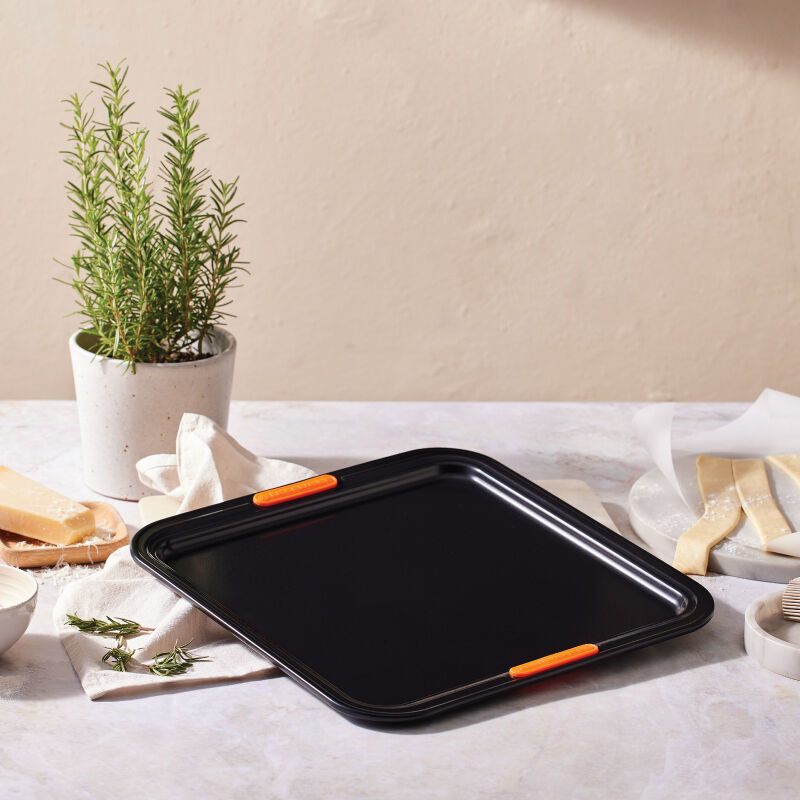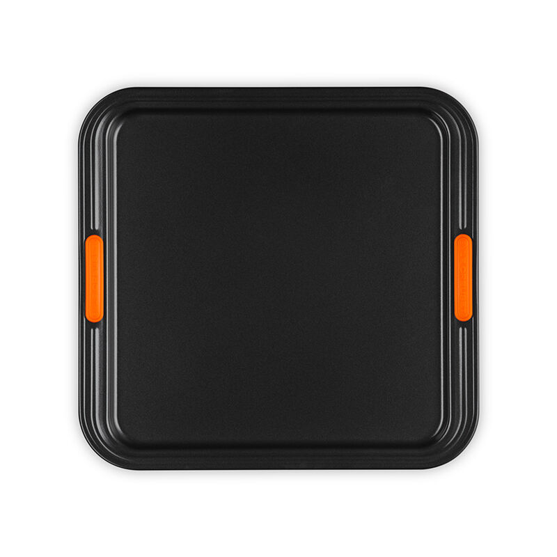 Bake perfectly golden-brown cookies, pastries and appetizers with the non-stick metal Square Baking Sheet. An innovative silicone coating ensures easy release and effortless cleanup, while two layers of carbon steel surround a pocket of air for superior heat conduction and even baking. Lightweight and durable, the wide rims with heat-resistant silicone grips makes it easy to transfer a full pan to and from a hot oven.