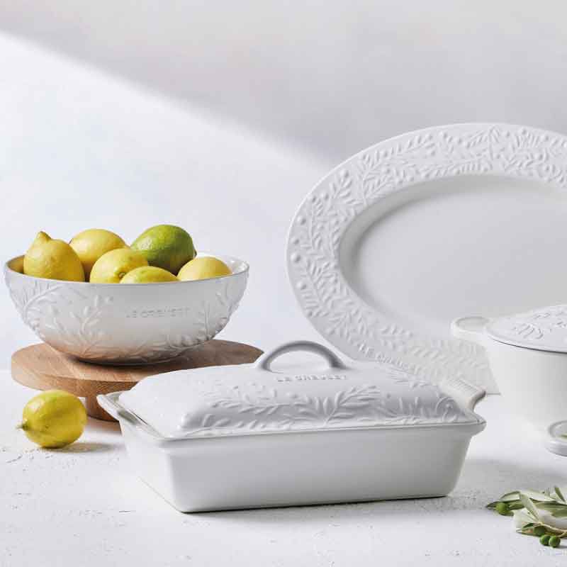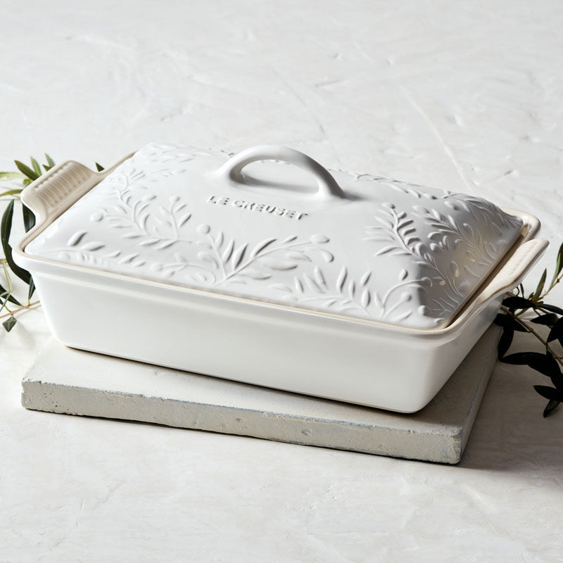 Inspired by the sun-drenched fields of Provence, the Olive Branch Heritage Rectangular Casserole baking dish is embossed with a refined olive branch motif that is a sophisticated addition to any kitchen or table. Both functional and beautiful, it¡¯s perfect for indulgent desserts, comforting casseroles, marinating meats, broiling fish and more. Not only does the stoneware lid lock in moisture and heat while baking, but makes it easy to carry dishes to potlucks and picnics or for storing leftovers ¨C or bring it straight from the oven to the table as an elegant serving piece. Crafted from the finest quality stoneware to ensure food is cooked to perfection, the baking dish features a colorful glaze that is virtually non-stick for easy cleanup.