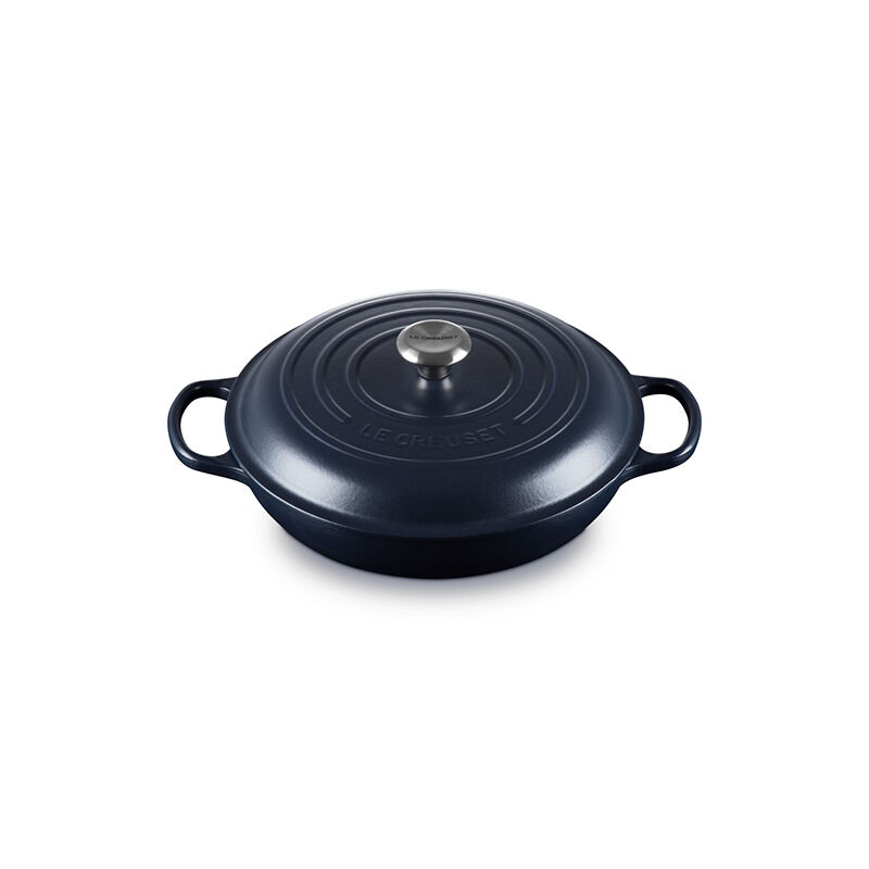 The Le Creuset enameled cast iron Braiser is uniquely designed to provide steady, even heat to transform tough cuts of meat and hearty vegetables into tender, flavorful dishes. The wide base allows ingredients to be placed in a single layer for searing without crowding; once liquid is added, the domed lid circulates steam to lock in moisture and flavor. The versatile shape of the braiser also makes it perfect for shallow frying, steaming, stews, casseroles and serving at the table.