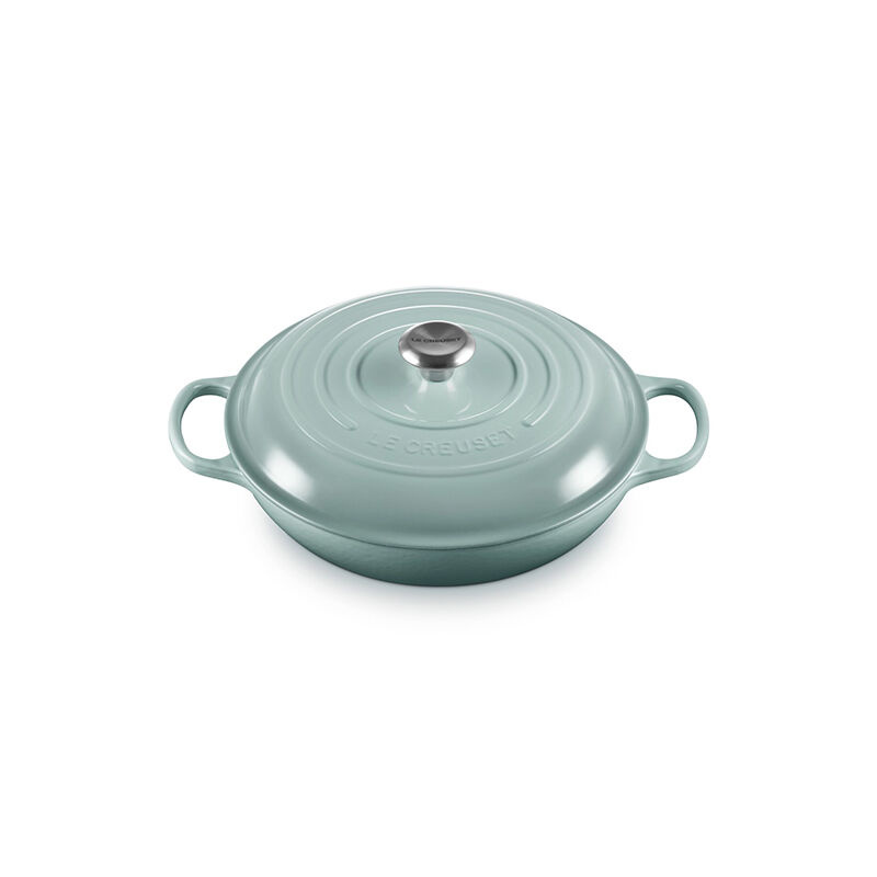The Le Creuset enameled cast iron Braiser is uniquely designed to provide steady, even heat to transform tough cuts of meat and hearty vegetables into tender, flavorful dishes. The wide base allows ingredients to be placed in a single layer for searing without crowding; once liquid is added, the domed lid circulates steam to lock in moisture and flavor. The versatile shape of the braiser also makes it perfect for shallow frying, steaming, stews, casseroles and serving at the table.