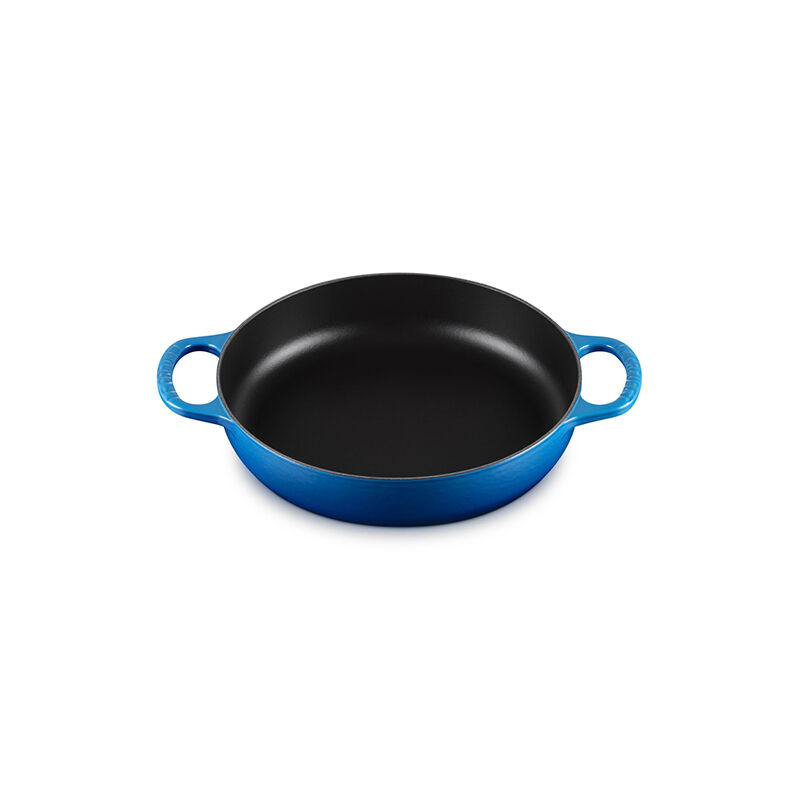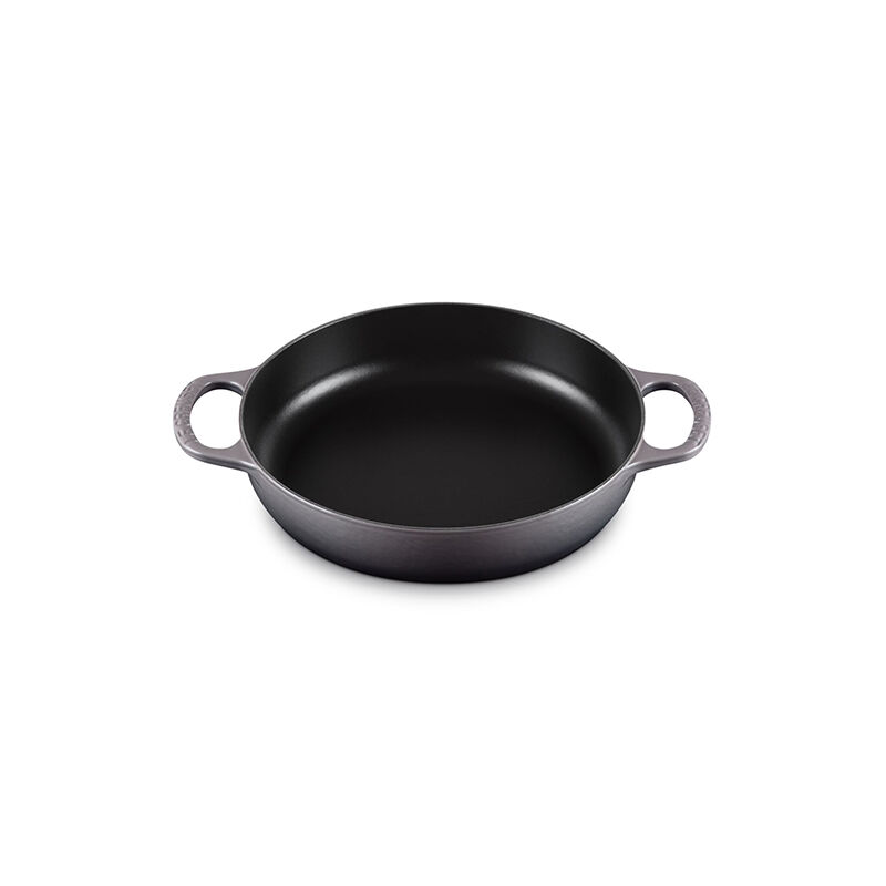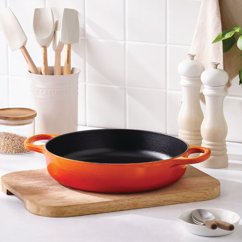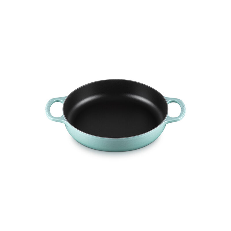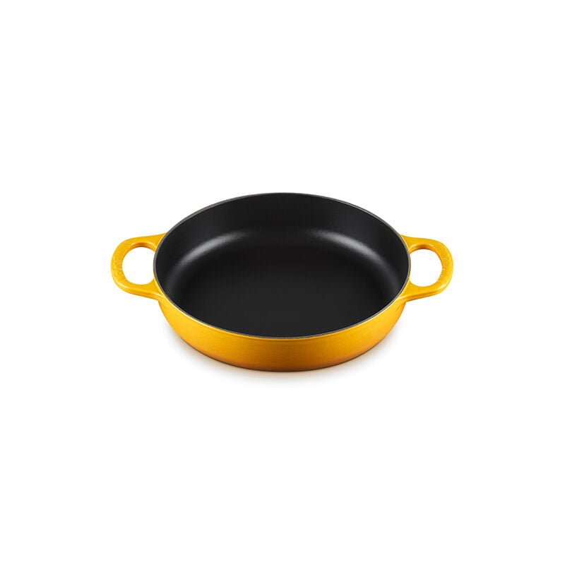 The enameled cast iron Signature Everyday Pan has a generous depth and wide surface area that is perfect for everything from pan roasting and frying to one pan meals, simmering sauces and more ??C it essentially combines the benefits of a braiser with the ease of use of a fry or saut??| pan. Slightly curved sides make it effortless to stir, flip and serve, while oversized handles provide a secure grip for transferring from stove to oven to table.