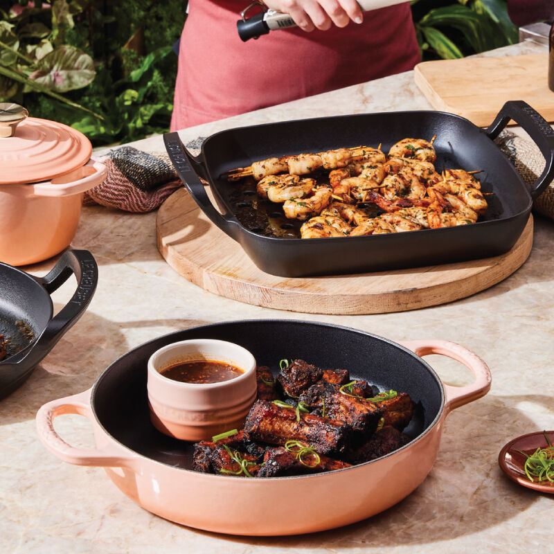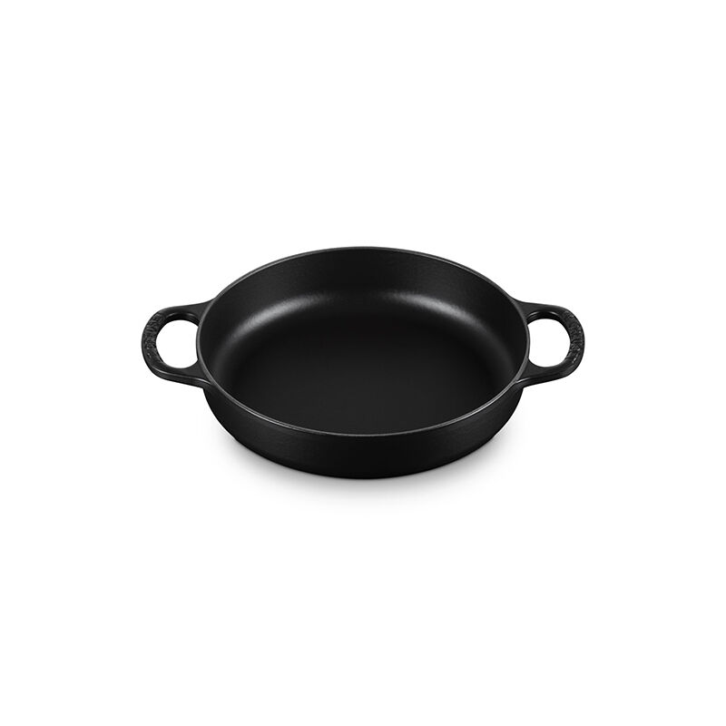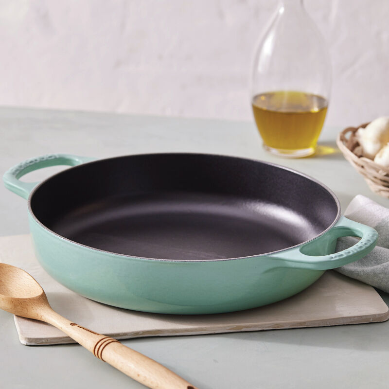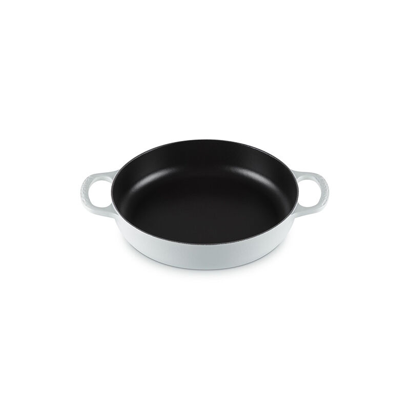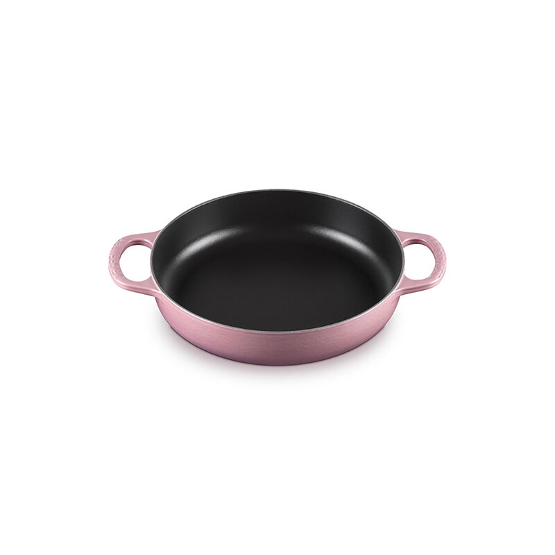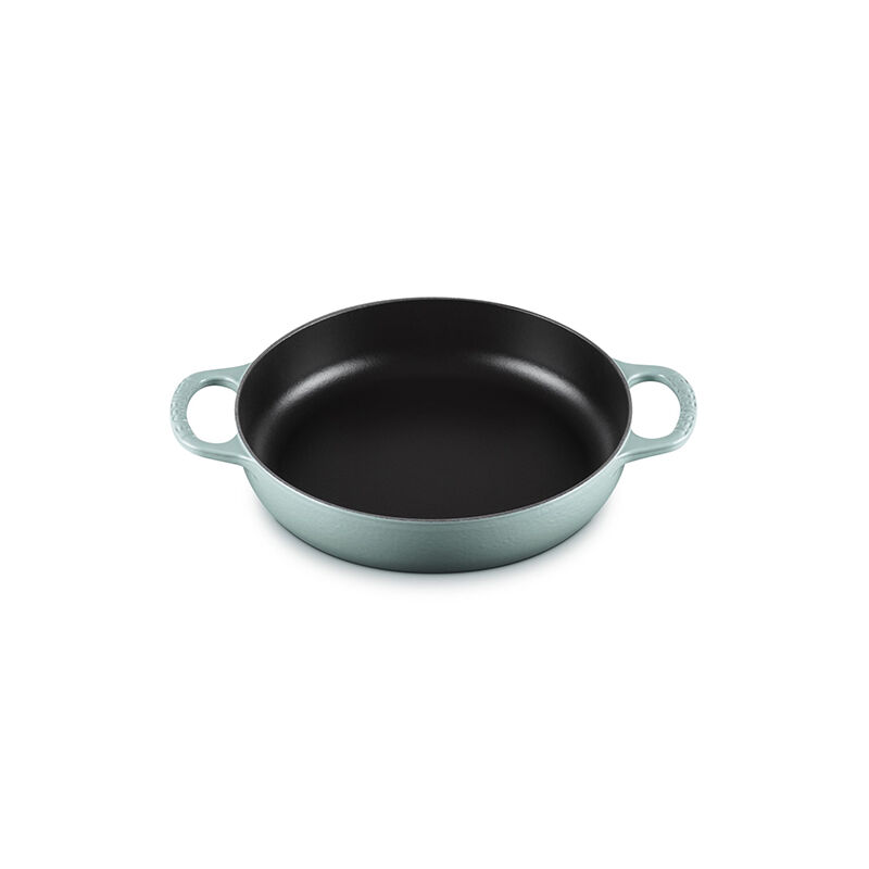 The enameled cast iron Signature Everyday Pan has a generous depth and wide surface area that is perfect for everything from pan roasting and frying to one pan meals, simmering sauces and more ??C it essentially combines the benefits of a braiser with the ease of use of a fry or saut??| pan. Slightly curved sides make it effortless to stir, flip and serve, while oversized handles provide a secure grip for transferring from stove to oven to table.
