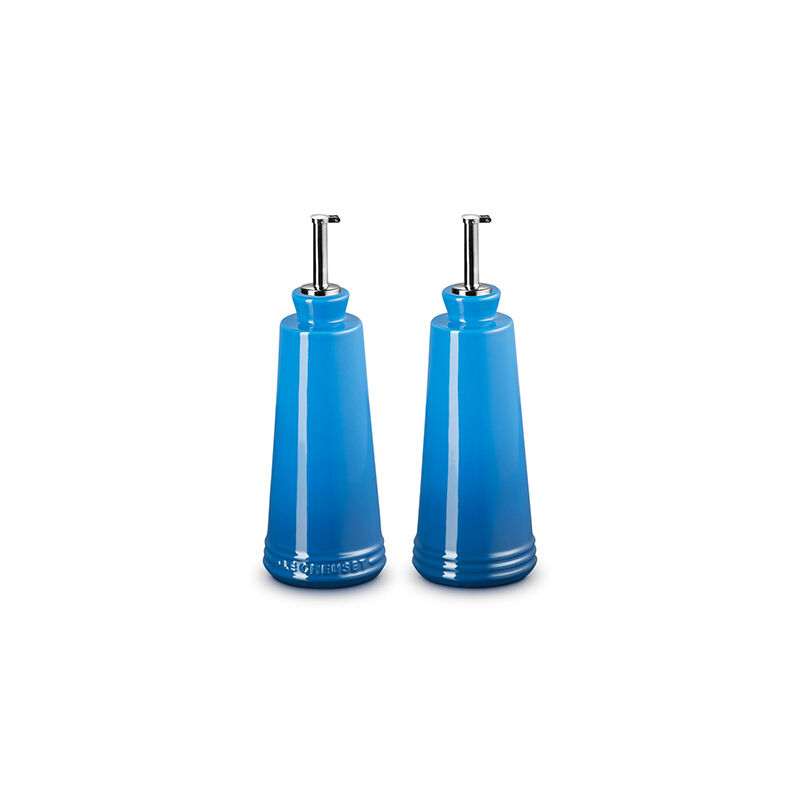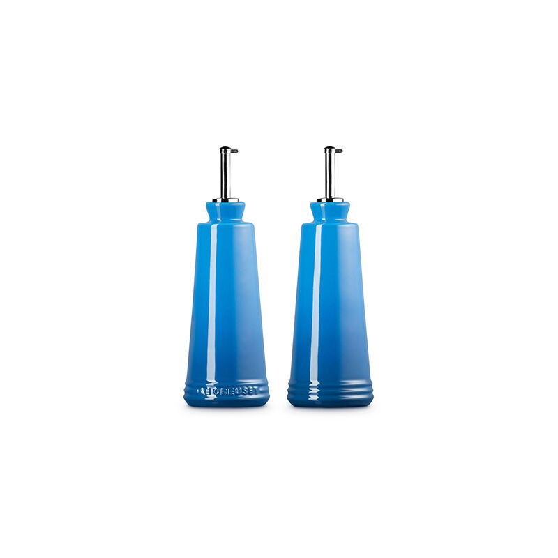 Whether prepping in the kitchen or serving at the table, the Oil and Vinegar cruets are designed to hold and serve all varieties of oils, vinegars and other liquids. Crafted from our finest quality stoneware to protect oils from the damaging effects of light and heat, the contemporary design features a stainless steel nozzle for precise control when pouring. They¡¯re finished with an impermeable glaze inside and out that is easy to clean and dishwasher-safe, while the addition of the Le Creuset name on one of the bottles makes it easy to distinguish between the set of two.