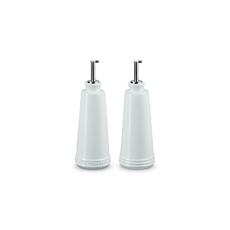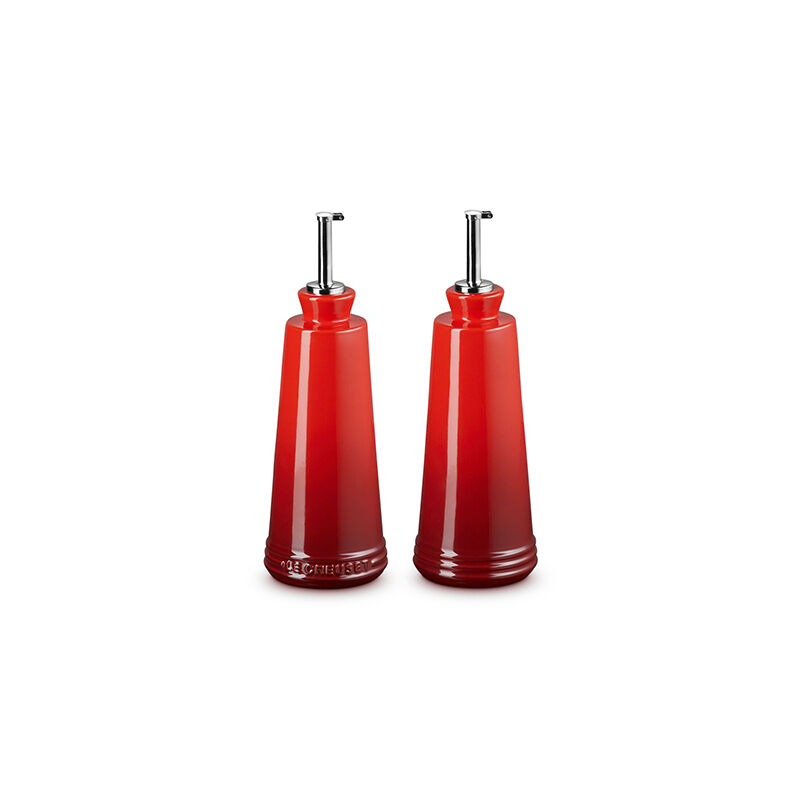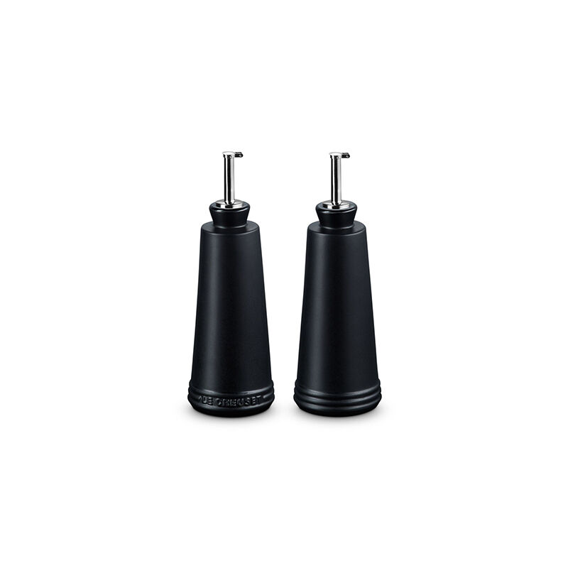 Whether prepping in the kitchen or serving at the table, the Oil and Vinegar cruets are designed to hold and serve all varieties of oils, vinegars and other liquids. Crafted from our finest quality stoneware to protect oils from the damaging effects of light and heat, the contemporary design features a stainless steel nozzle for precise control when pouring. They¡¯re finished with an impermeable glaze inside and out that is easy to clean and dishwasher-safe, while the addition of the Le Creuset name on one of the bottles makes it easy to distinguish between the set of two.