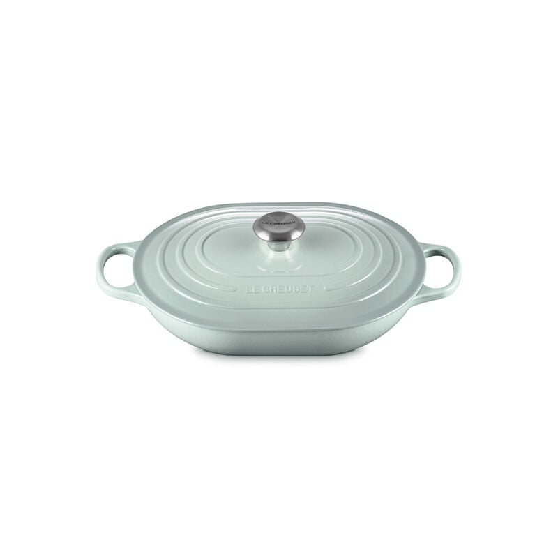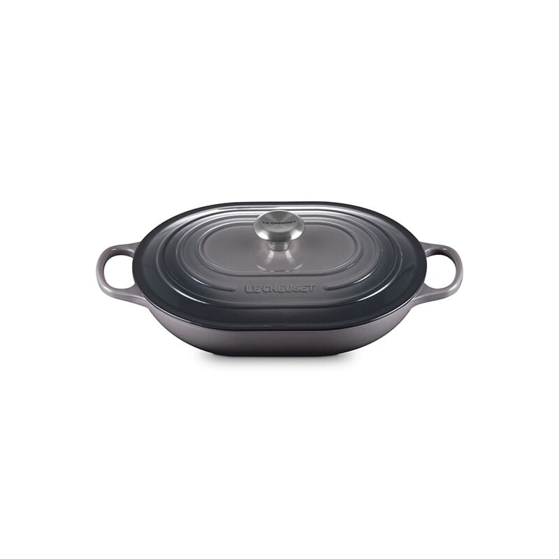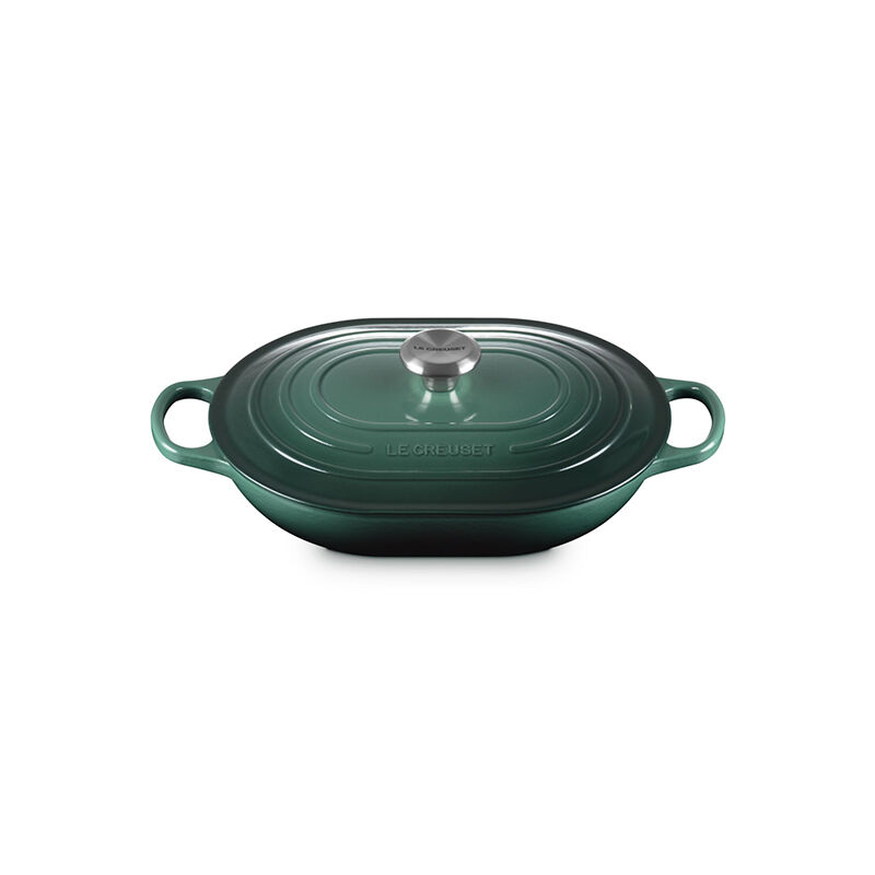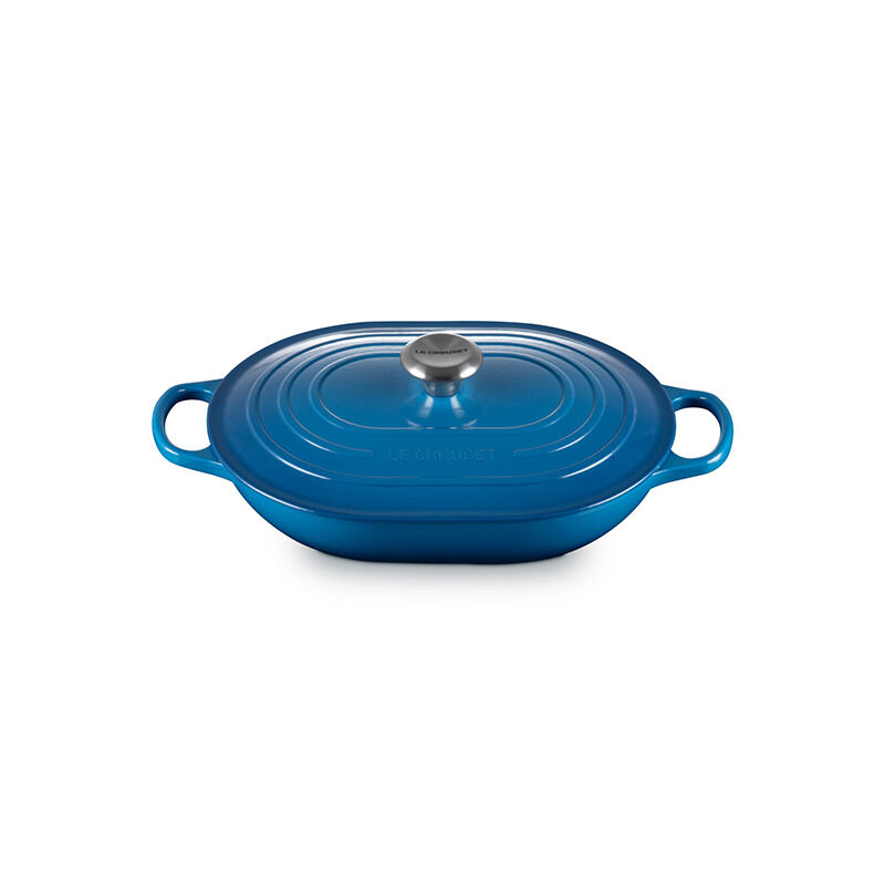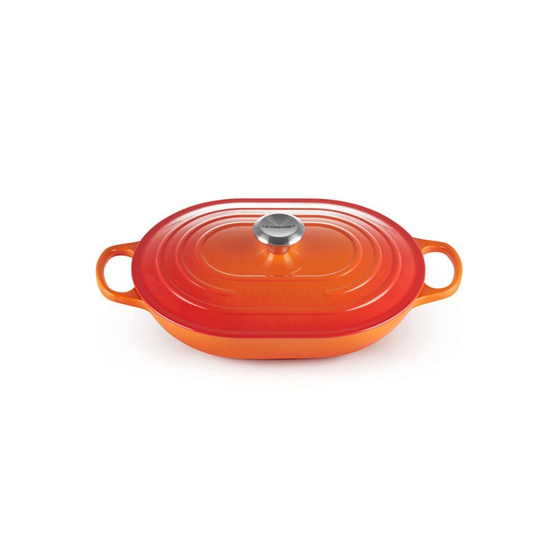Perfect for saut??|ing, shallow frying, steaming and serving dishes straight to the table, the enameled cast iron Signature Oval Casserole can handle everything from roasts and whole fish to vegetables and side dishes. The elongated oval shape is ideal for larger cuts of meat, hearty stews and baked casseroles meant to share. The sloped sides and wide cooking surface make stirring and serving a breeze. Use it with the lid as a traditional casserole for family meals, or without as a roaster or buffet dish when entertaining guests.