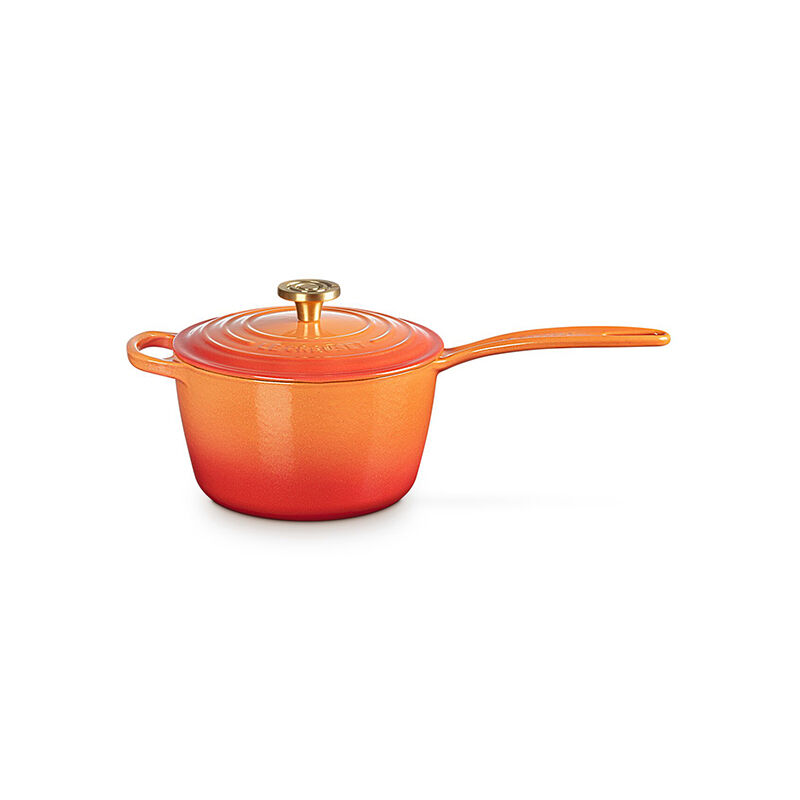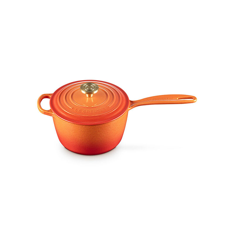 The enameled cast iron Signature Saucepan is a kitchen staple perfect for making sauces, but also for side dishes, preparing grains, poaching, simmering and reheating. The smoothly curved interior and rounded base are ideal for stirring and reducing sauces, while an extended helper handle and a contoured main handle provide added control for maneuvering from the kitchen to the table.