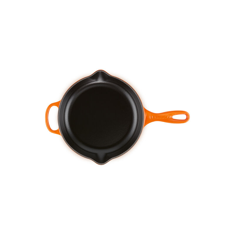 The enameled cast iron Signature Skillet is a versatile kitchen essential for searing, sauteing, stir-frying and more. The interior surface is finished with a black satin enamel that eliminates the need for the traditional seasoning and maintenance of raw cast iron. Specially formulated for higher surface temperature cooking, the enamel develops a natural patina over time making it virtually non-stick and easy to clean.