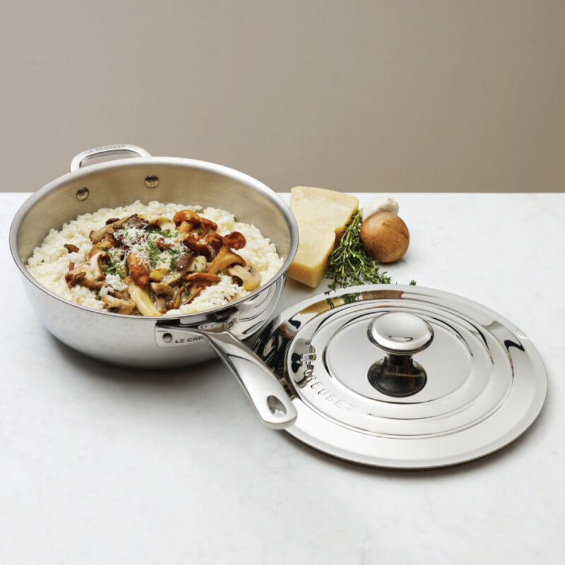 A chef’s favorite, the Signature Stainless Steel Saucier has a smooth contoured interior that is optimal for making sauces, risotto or saut¨¦ing vegetables. Sloping sides and a rounded bottom facilitate stirring and whisking, and also make cleanup easier than ever. Radiant and durable, the triple layer construction features a full base-to-rim aluminum core for superior heat distribution, while the lightweight titanium-infused stainless steel exterior resists scorching and corrosion at higher temperatures. Innovative details such as interior capacity markings, iconic three-ring lid with built-in steam vents, and a dripless pouring rim save valuable prep time and make cleanup a breeze.