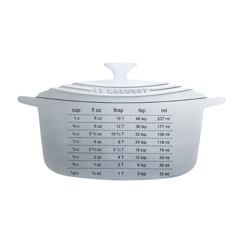 This sturdy magnet features a helpful unit conversion grid for cups, fluid ounces, tablespoons, teaspoons and milliliters, taking the guesswork out of doubling recipes or translating ingredient lists from metric units. With the unmistakable silhouette of Le Creuset Dutch Ovens, the magnet complements any Le Creuset lover’s collection.