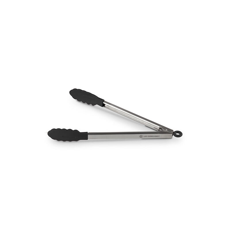 Keep hands clean and safely away from hot surfaces with these stainless steel tongs. Silicone heads handle food gently without piercing or tearing delicate foods. Handles lock for compact storage.