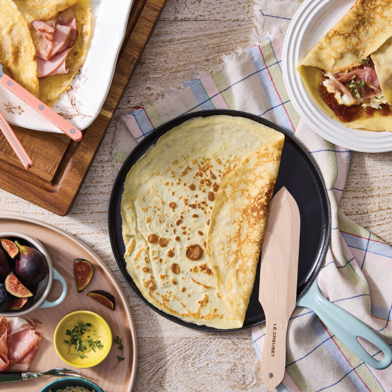 The enameled cast iron Traditional Crepe Pan features a low profile and gently sloping sides, making it perfect for creating delicate French crepes¡ªas well as flipping pancakes, hash browns and fritters with ease. Its smooth black satin enamel surface heats evenly and requires no seasoning, while the circular shape helps batter spread thinly and consistently. Use the included T-shaped rateau (rake) to distribute the batter in a smooth, circular motion, and the thin spatula to flip with precision. Fill, fold, and enjoy!