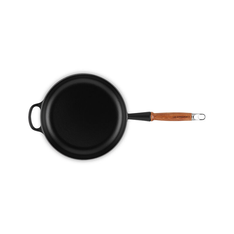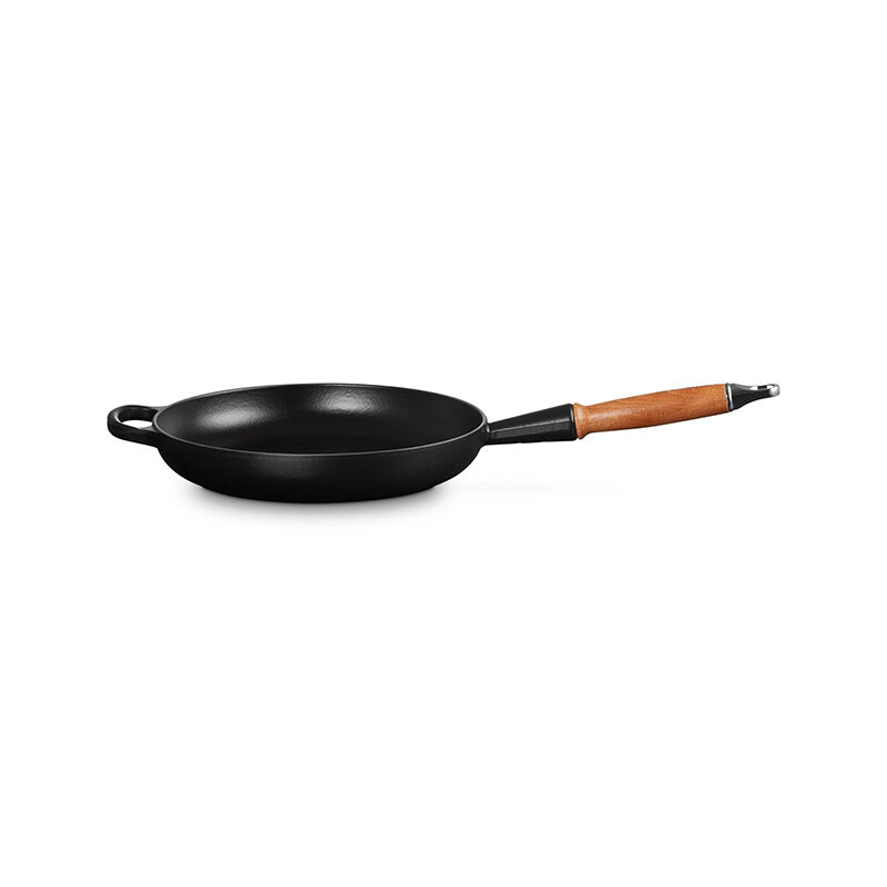A vintage Le Creuset design refreshed for modern kitchens, the enameled cast iron Alpine Wood Handle Fry Pan is a versatile pan for everything from searing and saut¨¦ing, to pan frying, stovetop casseroles and more. Sloped sides make it easy to stir sauces and flip crepes, while exceptional heat distribution and retention ensures food is cooked to perfection. The black satin enamel interior eliminates the need for the traditional seasoning and maintenance of raw cast iron ¨C the enamel develops a natural patina over time making it virtually non-stick and easy to clean. The pan is finished with a durable wood handle that is designed to stay cool and comfortable while cooking, yet elegantly handsome for stove to table serving.