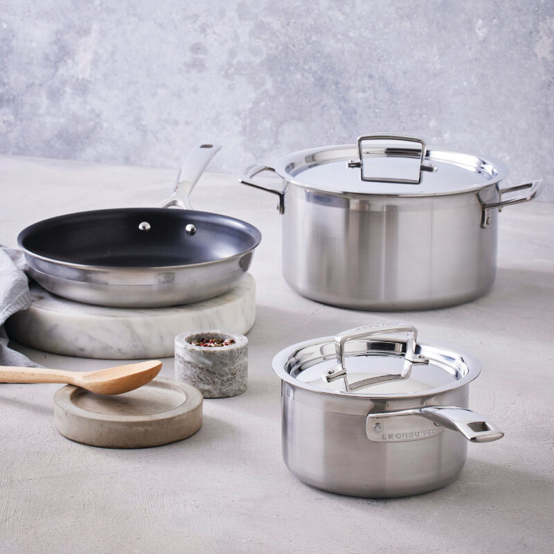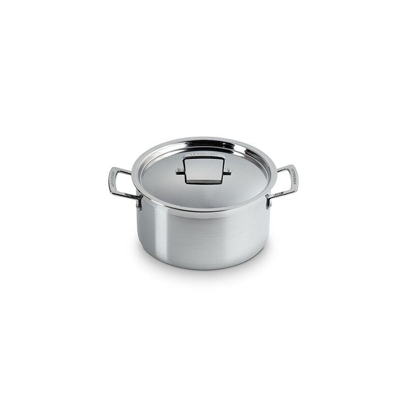 Le Creuset Classic Stainless Steel delivers long-lasting durability and exceptional performance, designed for the passionate cook looking to level up. A durable kitchen workhorse, it features triple-layer construction with an aluminum core bonded between layers of stainless steel, ensuring even heat distribution for exceptional results every time. The satin matte exterior, blended with polished accents, resists scratches, marks and fingerprints, maintaining its timeless elegance through daily use. Thoughtful details like angular loop lids and ergonomic handles add a touch of modern sophistication, while practical features such as etched capacity markings and a dripless pouring rim make preparation seamless and cleanup a breeze.