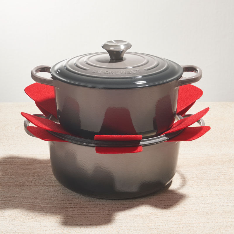 Tough and durable, felt Cookware Protectors provide a soft, cushioned layer between nested or stacked pots and pans when stored. Designed to help prevent chips and scratches, the generously sized 15 3/4¡± star design will accommodate your largest and deepest pots. Or the long-lasting felt fabric can be cut to fit in between smaller sized cookware and will not fray.