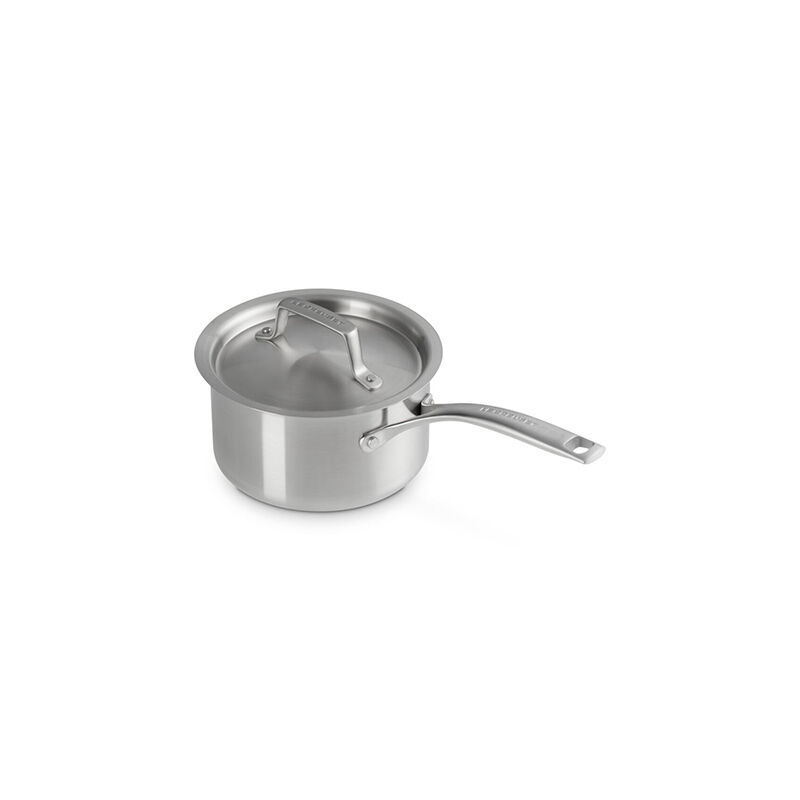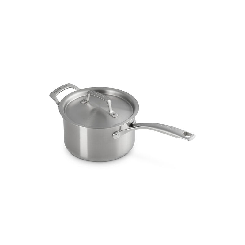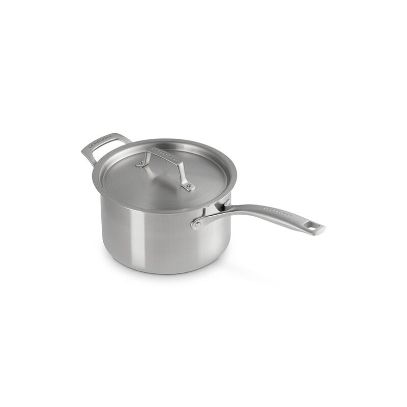 Expertly constructed for everyday versatility, the Essential Stainless Steel Saucepan effortlessly blends form and function. Its performance-driven tri-ply design is perfect for making sauces, preparing grains and side dishes, poaching, simmering and reheating with ease. The durable, low maintenance brushed exterior ensures easy cleaning and a hardwearing finish, while an aluminum core is bonded between layers of stainless steel for even heat distribution. Innovative details such as capacity markings and a dripless pouring rim save valuable prep time and make cleanup a breeze.?