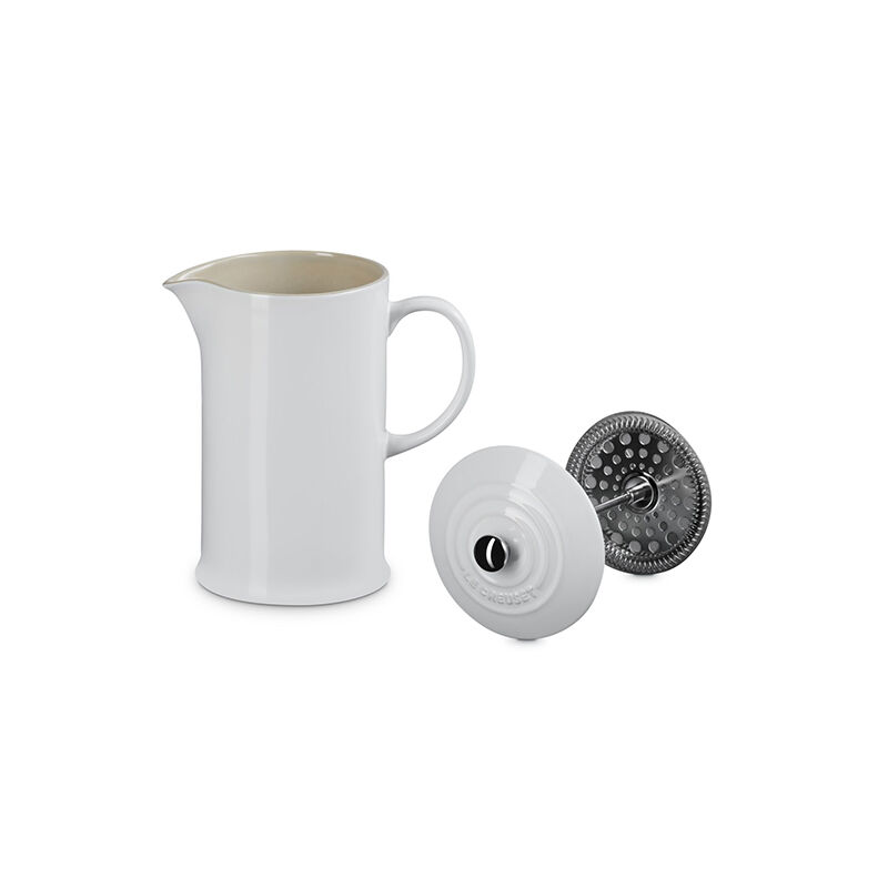 The French Press is one of the easiest methods to make great tasting coffee at home. Coarsely ground coffee beans or loose tea leaves are steeped in boiling water, and then filtered away by plunging the mesh sieve through the press. Crafted from premium stoneware for excellent heat retention, the Le Creuset French Press is finished with a vibrant glaze which is easy to clean, dishwasher-safe, and resistant to chips, scratches and stains.