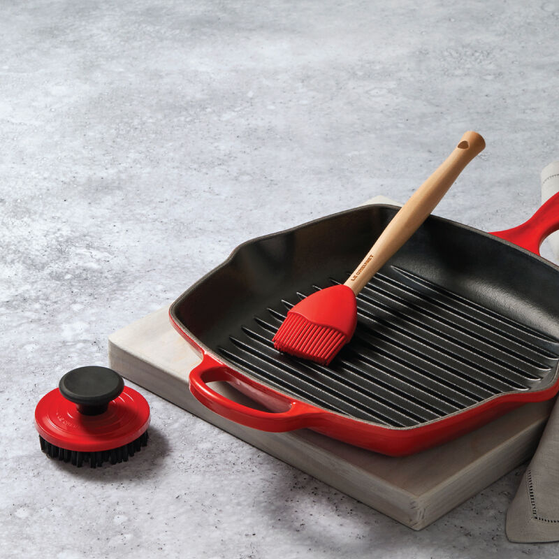 The perfect complement to our grill pans, the Grill Pan Brush has tough, durable nylon bristles that make quick work of removing stuck-on foods from enameled cast iron cooking surfaces. Its purpose-driven bristle design is especially helpful for cleaning between the ridges of grill pans.