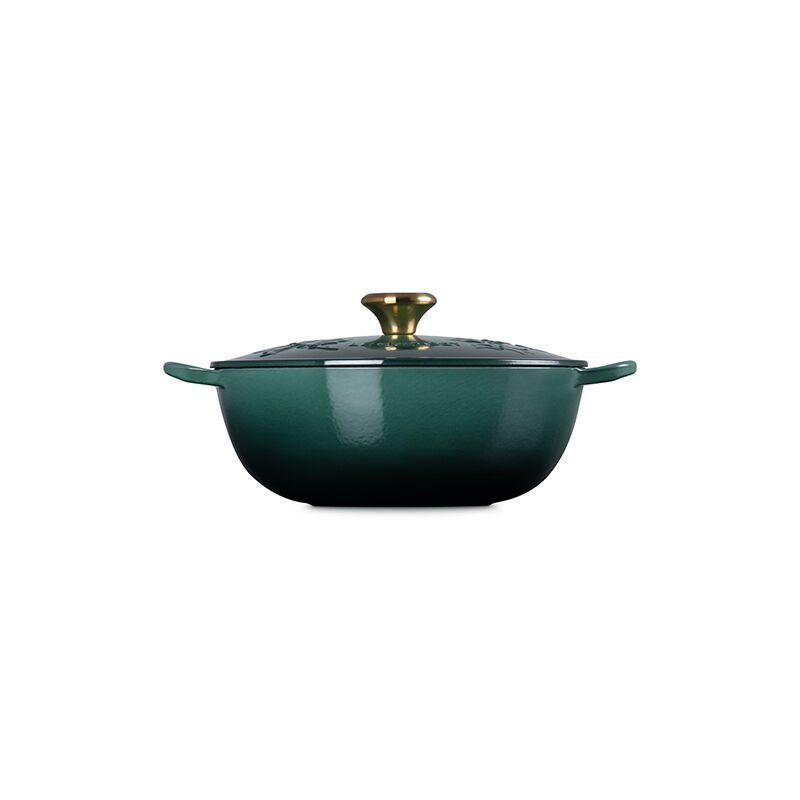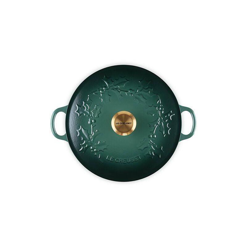 The Holly Collection Traditional Chef¡¯s Oven features an elegantly scrolled and embossed holly leaf design that will spread good cheer and joyful style year after year. Both functional and beautiful, it¡¯s the ideal vessel for merry soups, pastas, braising and even baking. Sloped sides increase the efficiency and effectiveness of stirring by promoting continuous movement even with the lid in place, and the depth provides ample room for simmering. Crafted from our legendary enameled cast iron, it has exceptional heat distribution and retention qualities to lock in flavor and loop handles designed for easy lifting. The festive, colorful enameled surface minimizes sticking and staining, requires no pre-seasoning, and is easy-to-clean.