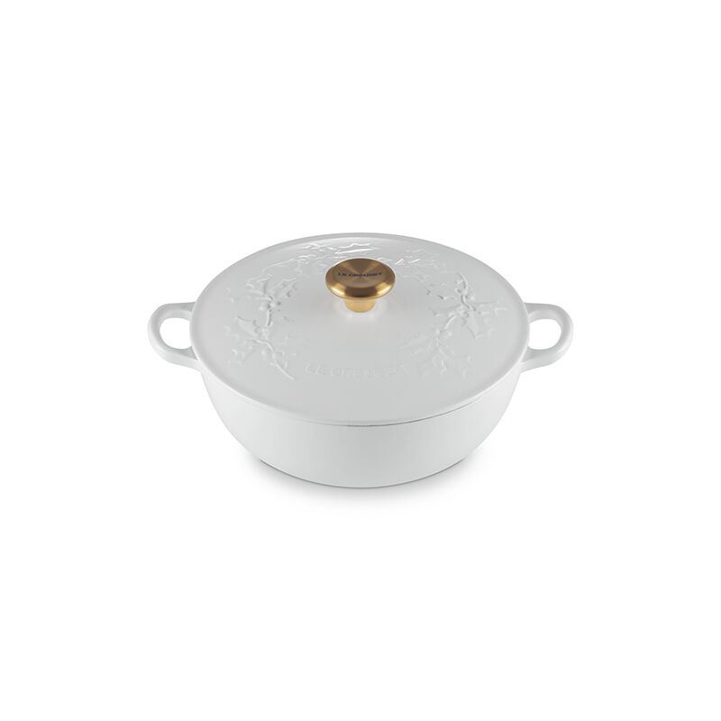 The Holly Collection Traditional Chef¡¯s Oven features an elegantly scrolled and embossed holly leaf design that will spread good cheer and joyful style year after year. Both functional and beautiful, it¡¯s the ideal vessel for merry soups, pastas, braising and even baking. Sloped sides increase the efficiency and effectiveness of stirring by promoting continuous movement even with the lid in place, and the depth provides ample room for simmering. Crafted from our legendary enameled cast iron, it has exceptional heat distribution and retention qualities to lock in flavor and loop handles designed for easy lifting. The festive, colorful enameled surface minimizes sticking and staining, requires no pre-seasoning, and is easy-to-clean.