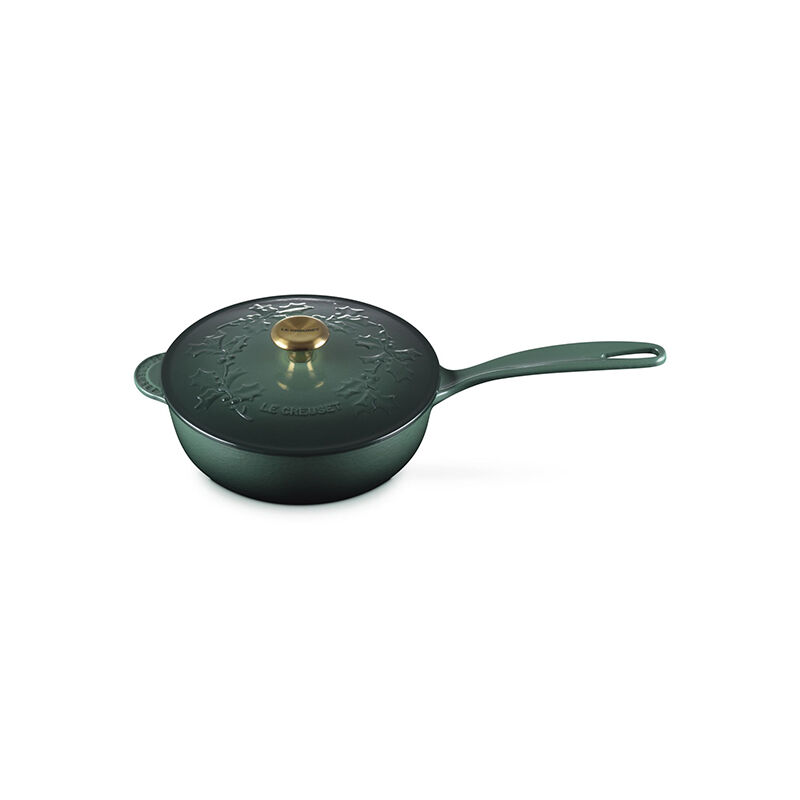 The Holly Collection Traditional Saucier features an elegantly scrolled and embossed holly leaf design that will spread good cheer and joyful style year after year. A chef¡¯s favorite, the Saucier has a smooth contoured interior that is optimal for making merry sauces, side dishes and saut¨¦ing vegetables. Sloping sides and a rounded bottom facilitate stirring and whisking, while the broad surface area allows liquids to evaporate quickly. Crafted from our legendary enameled cast iron, it has exceptional heat distribution and retention qualities to lock in flavor and moisture and keep dishes warm from stove to oven to table. The festive, colorful enameled surface minimizes sticking and staining, requires no pre-seasoning, and is easy-to-clean.