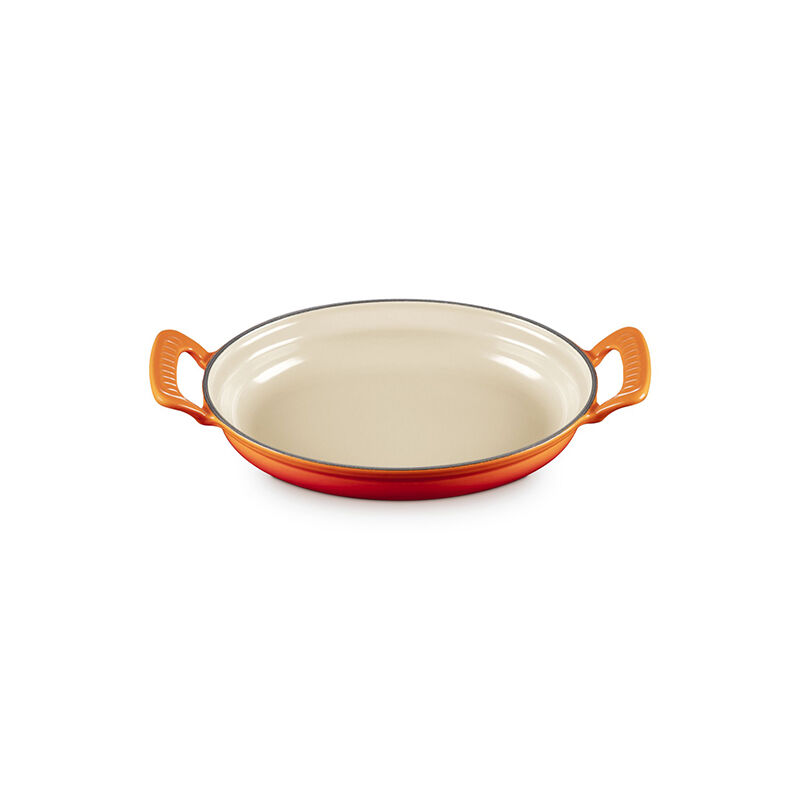 The Oval Gratin is ideal for roasting, baking, casseroles, side dishes and more. The shallow, low-profile design allows heat to circulate around the food for optimal browning and crisping, while the longer, oval shape is perfectly sized for pork roasts, sides of salmon and roasting vegetables. Finished with a colorful exterior and open scalloped handles, it’s ideal for cooking and serving from stove to oven to table.