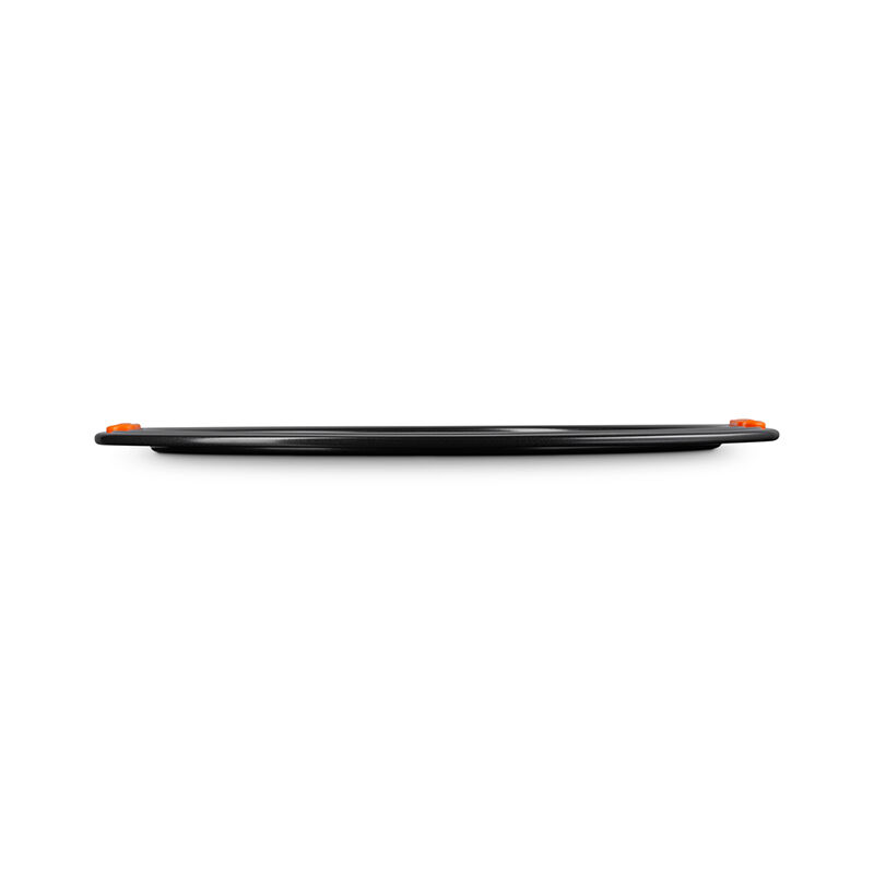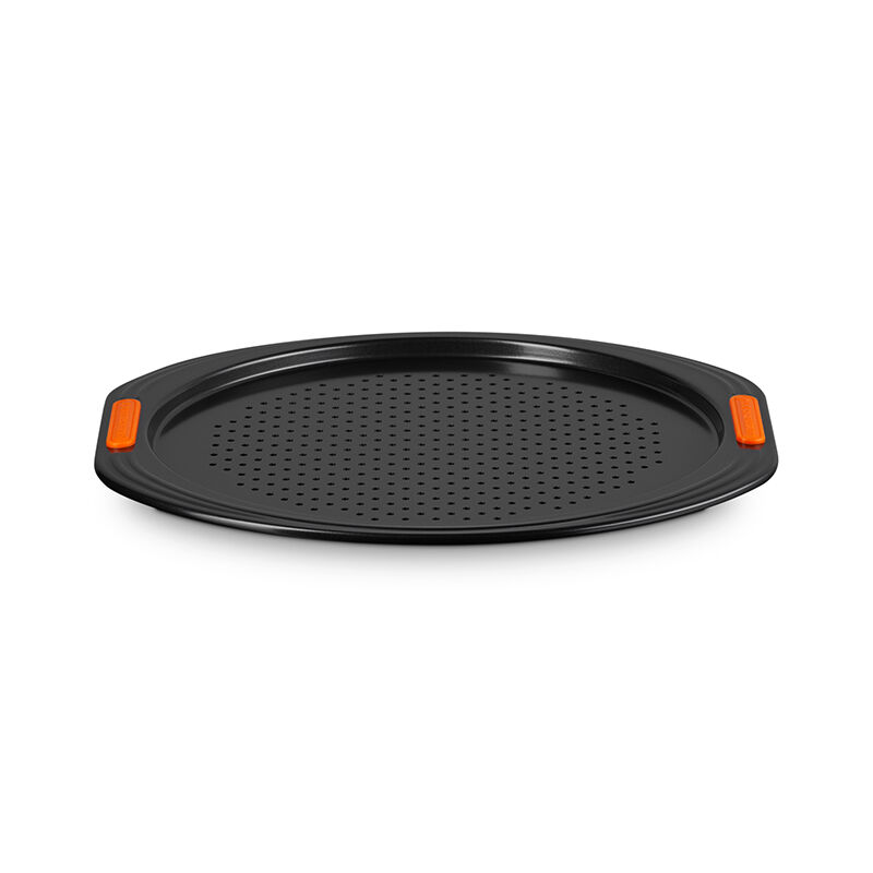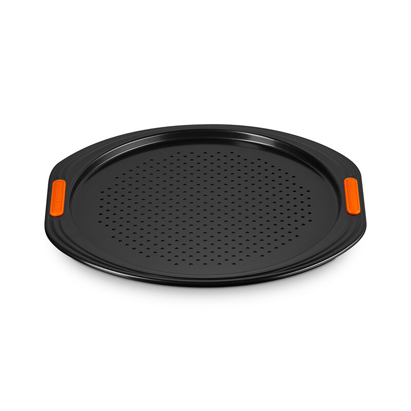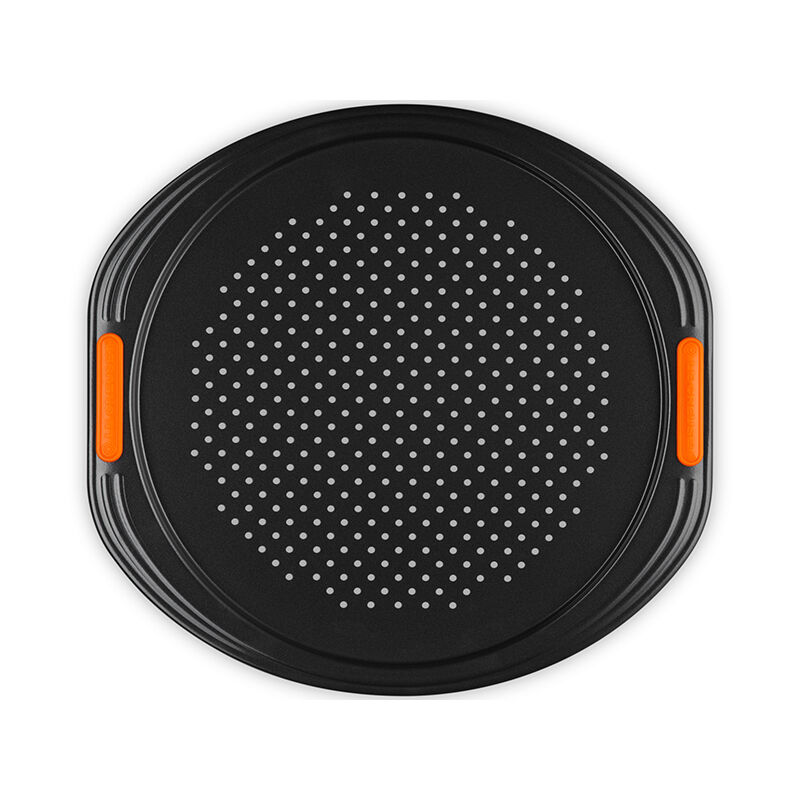 Bake homemade pizza with a perfectly crispy, golden brown crust with the non-stick Pizza Pan. Small holes allow the dough to heat quickly and evenly, and the heavy-gauge carbon steel construction delivers superior heat conduction and even baking. Lightweight and durable, an innovative silicone coating ensures easy release and effortless cleanup, while the wide rims with heat-resistant silicone grips make it easy to transfer the pan to and from a hot oven.