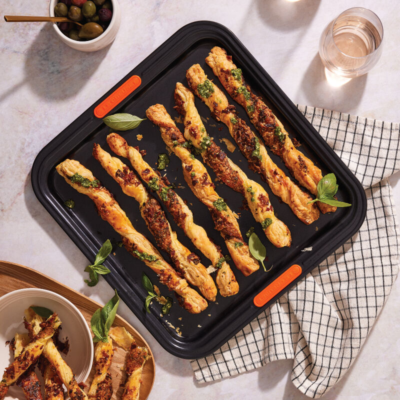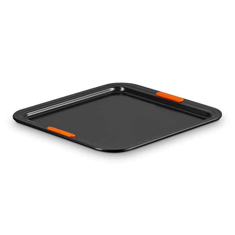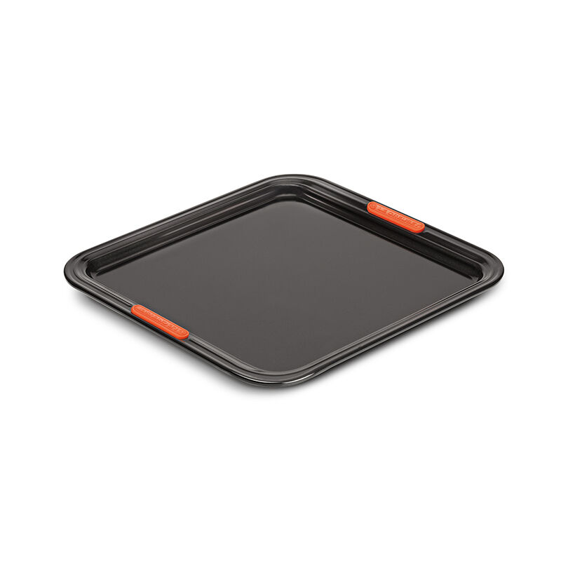 Bake perfectly golden-brown cookies, pastries and appetizers with the non-stick metal Square Baking Sheet. An innovative silicone coating ensures easy release and effortless cleanup, while two layers of carbon steel surround a pocket of air for superior heat conduction and even baking. Lightweight and durable, the wide rims with heat-resistant silicone grips makes it easy to transfer a full pan to and from a hot oven.