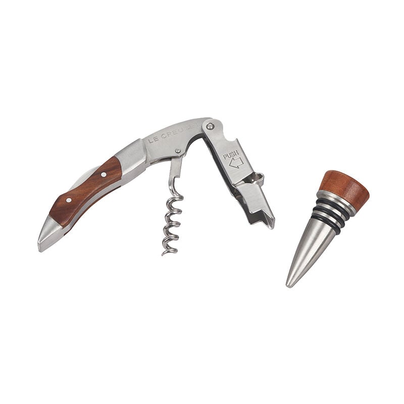 Waiters and sommeliers rely on the pocket-size Waiter’s Friend corkscrew to open wine bottles quickly and easily. The elegant two-step design allows for optimal leverage, and the coated stainless steel screw slides easily into all corks including both natural and synthetic. Crafted with a rich, rosewood handle for an ergonomic grip, the foldable foil cutter blade and built-in bottle opener make this a multi-purpose tool. It¡¯s paired with a handsome wine stopper that creates a firm seal to preserve the flavor and aroma of opened wine. The set is packaged in a giftable box that is perfect for the budding bartender, or luxurious complement to an existing collection.