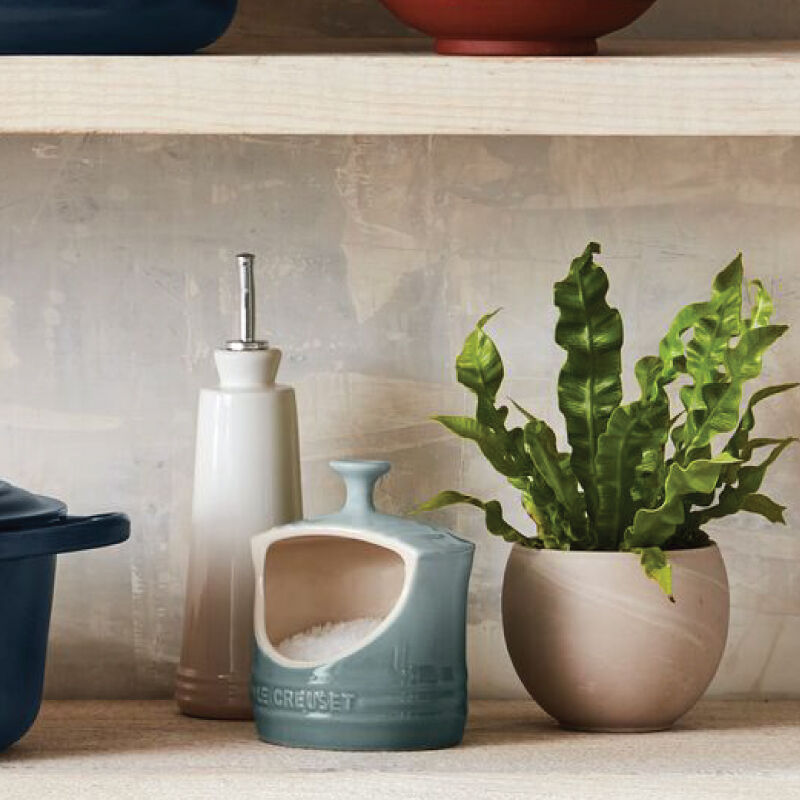 This old-world style crock features a large side opening that provides easy access to salt or other spices and seasonings during cooking.