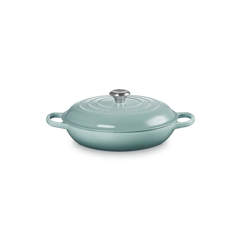 The Le Creuset enameled cast iron Braiser is uniquely designed to provide steady, even heat to transform tough cuts of meat and hearty vegetables into tender, flavorful dishes. The wide base allows ingredients to be placed in a single layer for searing without crowding; once liquid is added, the domed lid circulates steam to lock in moisture and flavor. The versatile shape of the braiser also makes it perfect for shallow frying, steaming, stews, casseroles and serving at the table.