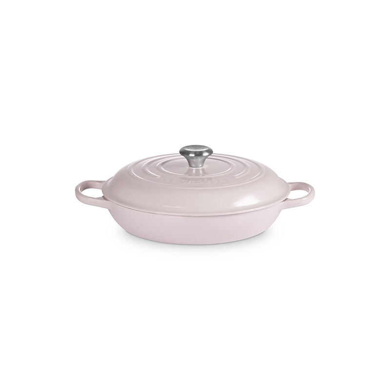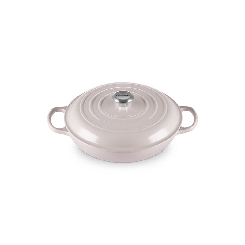 The Le Creuset enameled cast iron Braiser is uniquely designed to provide steady, even heat to transform tough cuts of meat and hearty vegetables into tender, flavorful dishes. The wide base allows ingredients to be placed in a single layer for searing without crowding; once liquid is added, the domed lid circulates steam to lock in moisture and flavor. The versatile shape of the braiser also makes it perfect for shallow frying, steaming, stews, casseroles and serving at the table.