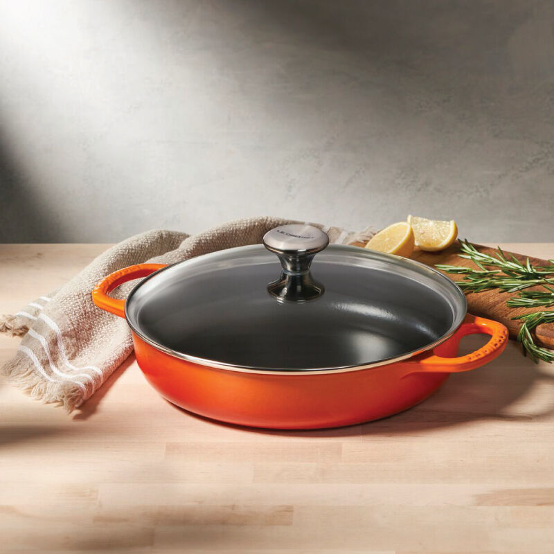 The enameled cast iron Signature Everyday Pan has a generous depth and wide surface area that is perfect for everything from pan roasting and frying to one pan meals, simmering sauces and more ??C it essentially combines the benefits of a braiser with the ease of use of a fry or saut??| pan. Slightly curved sides make it effortless to stir, flip and serve, while oversized handles provide a secure grip for transferring from stove to oven to table.