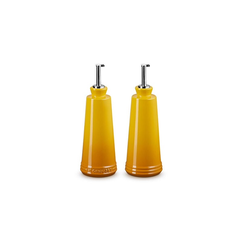 Whether prepping in the kitchen or serving at the table, the Oil and Vinegar cruets are designed to hold and serve all varieties of oils, vinegars and other liquids. Crafted from our finest quality stoneware to protect oils from the damaging effects of light and heat, the contemporary design features a stainless steel nozzle for precise control when pouring. They¡¯re finished with an impermeable glaze inside and out that is easy to clean and dishwasher-safe, while the addition of the Le Creuset name on one of the bottles makes it easy to distinguish between the set of two.