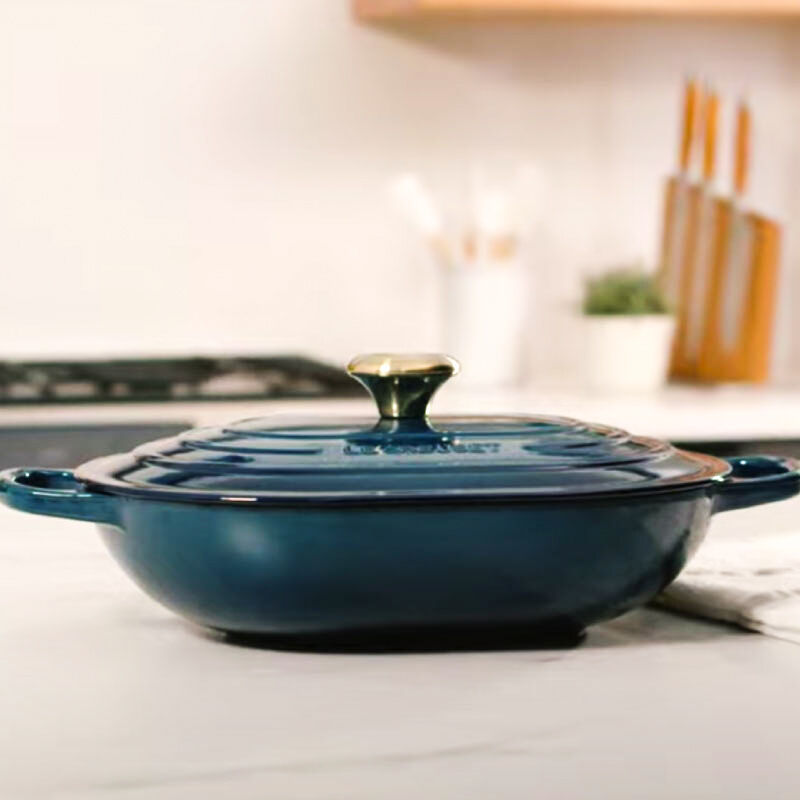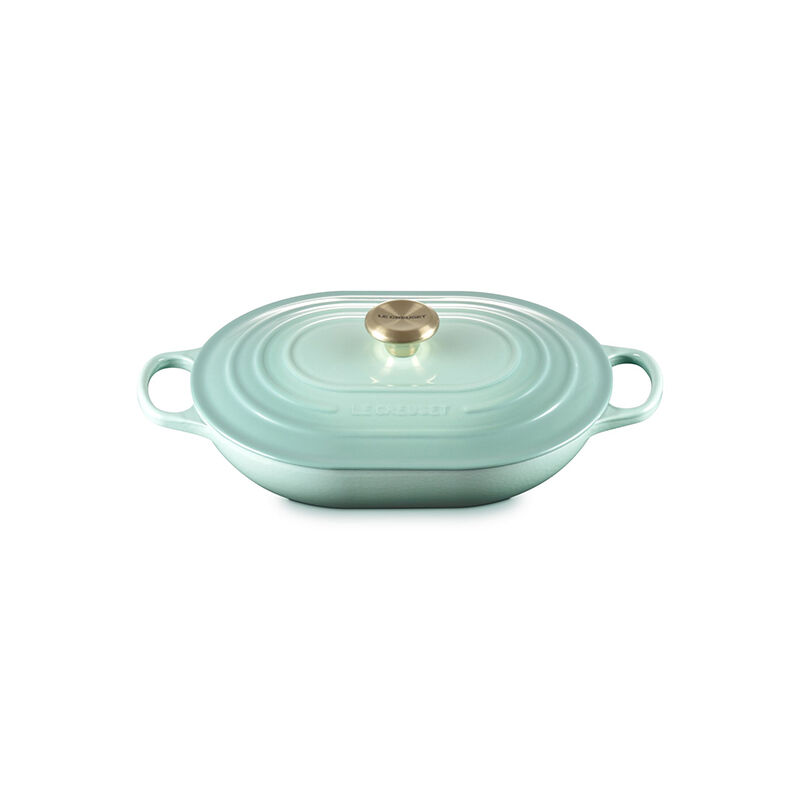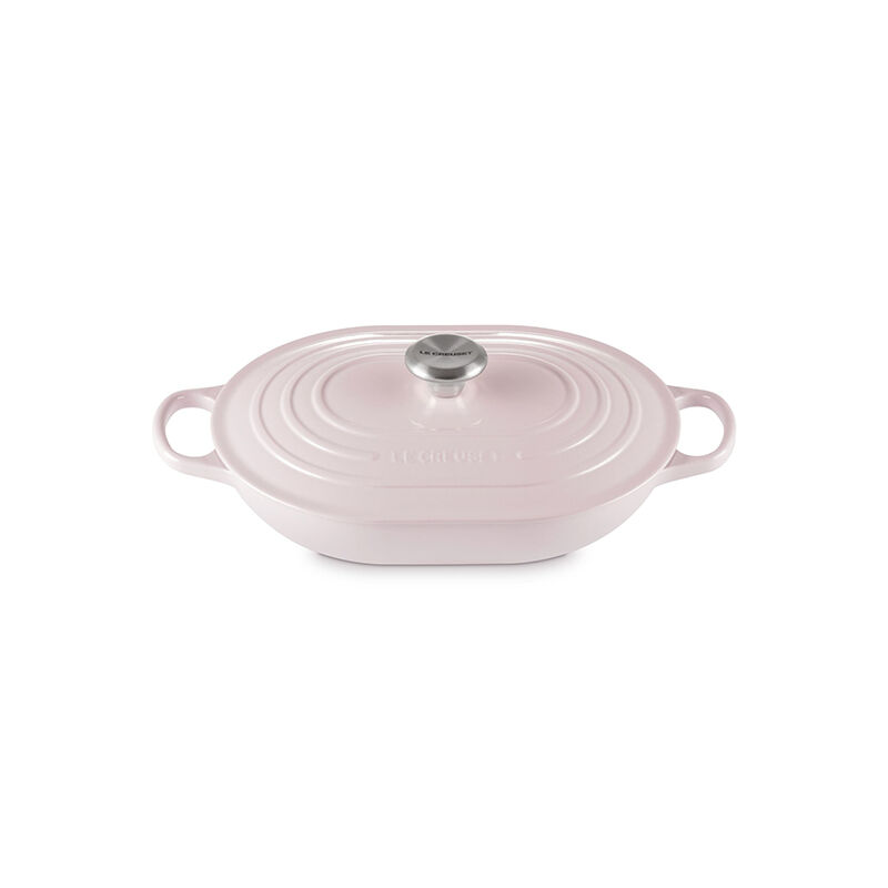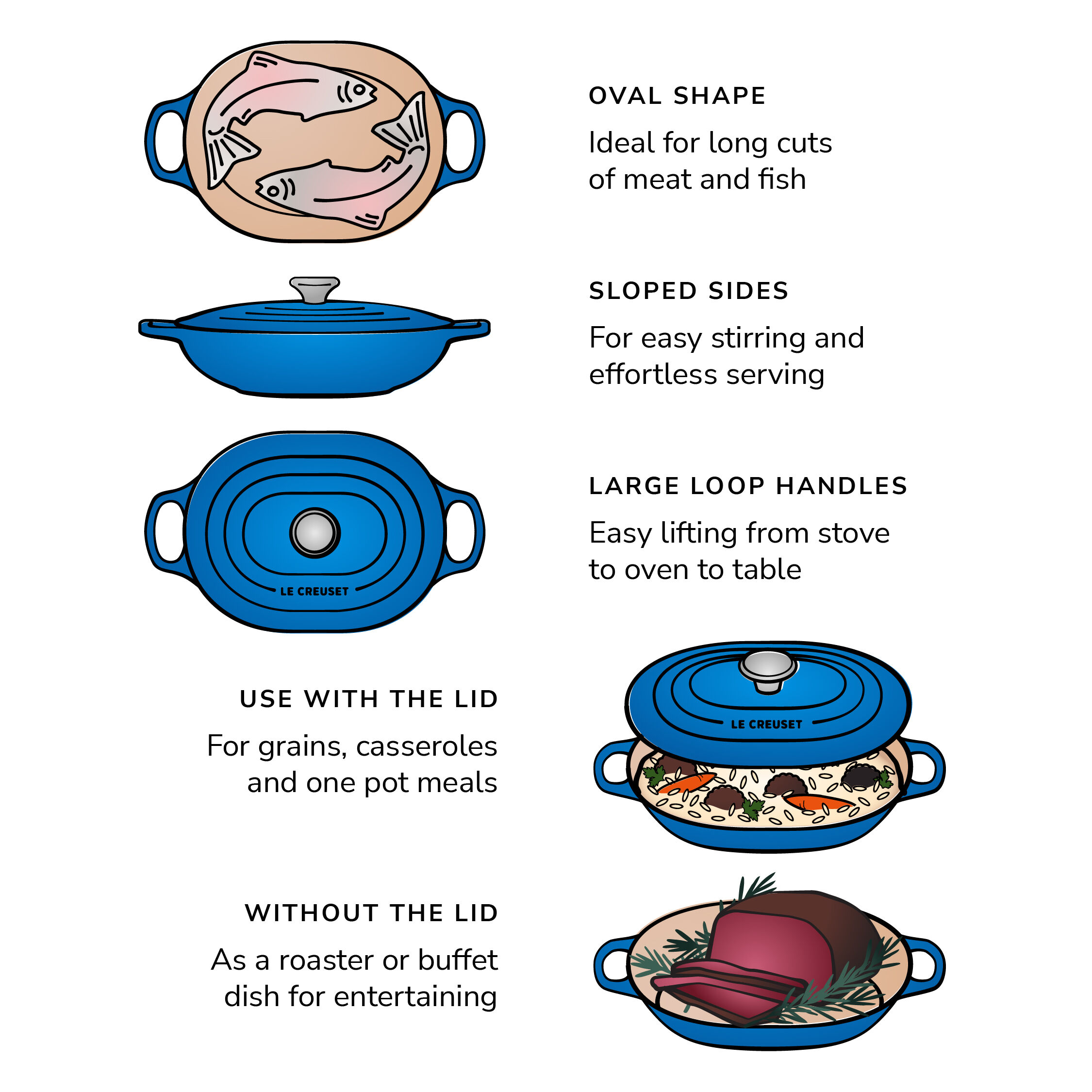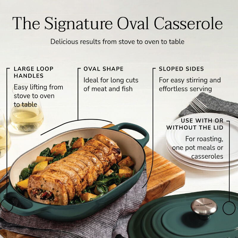 Perfect for saut??|ing, shallow frying, steaming and serving dishes straight to the table, the enameled cast iron Signature Oval Casserole can handle everything from roasts and whole fish to vegetables and side dishes. The elongated oval shape is ideal for larger cuts of meat, hearty stews and baked casseroles meant to share. The sloped sides and wide cooking surface make stirring and serving a breeze. Use it with the lid as a traditional casserole for family meals, or without as a roaster or buffet dish when entertaining guests.