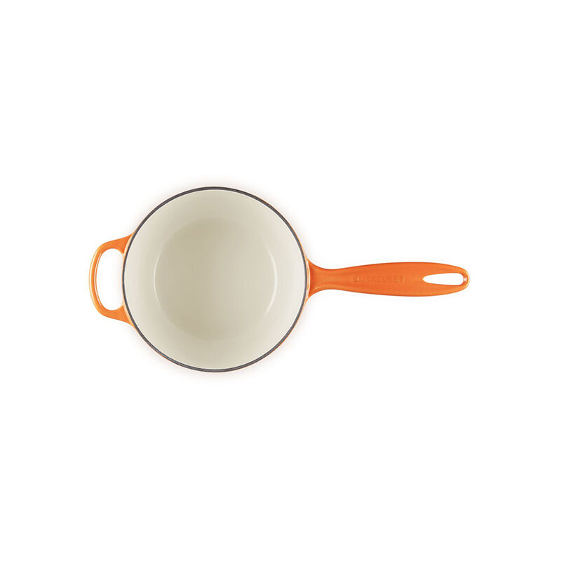 The enameled cast iron Signature Saucepan is a kitchen staple perfect for making sauces, but also for side dishes, preparing grains, poaching, simmering and reheating. The smoothly curved interior and rounded base are ideal for stirring and reducing sauces, while an extended helper handle and a contoured main handle provide added control for maneuvering from the kitchen to the table.