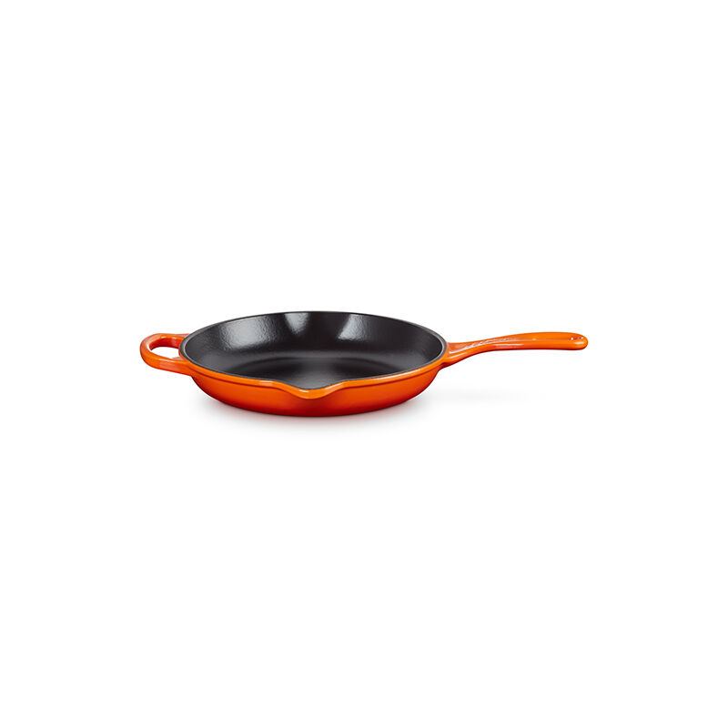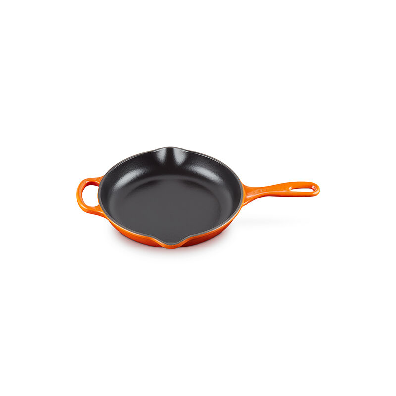 The enameled cast iron Signature Skillet is a versatile kitchen essential for searing, sauteing, stir-frying and more. The interior surface is finished with a black satin enamel that eliminates the need for the traditional seasoning and maintenance of raw cast iron. Specially formulated for higher surface temperature cooking, the enamel develops a natural patina over time making it virtually non-stick and easy to clean.